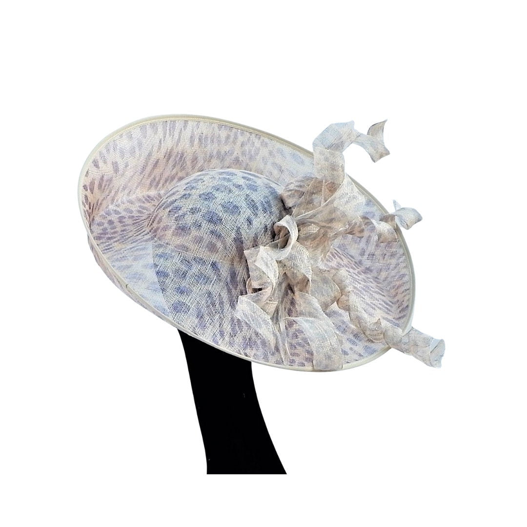 The most fabulous Leopard print sinamay feature hat adorned with matching sinamay twists. This is a shallow crown and is secured with the extra security of a hat elastic which if not needed can be pushed up insde the crown out of the way.Please note:- Handmade in the United Kingdom