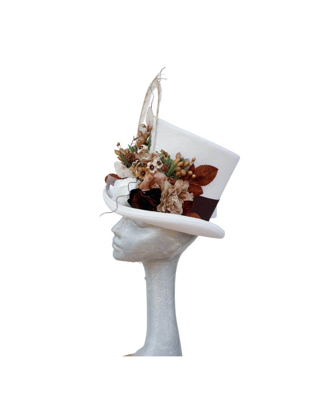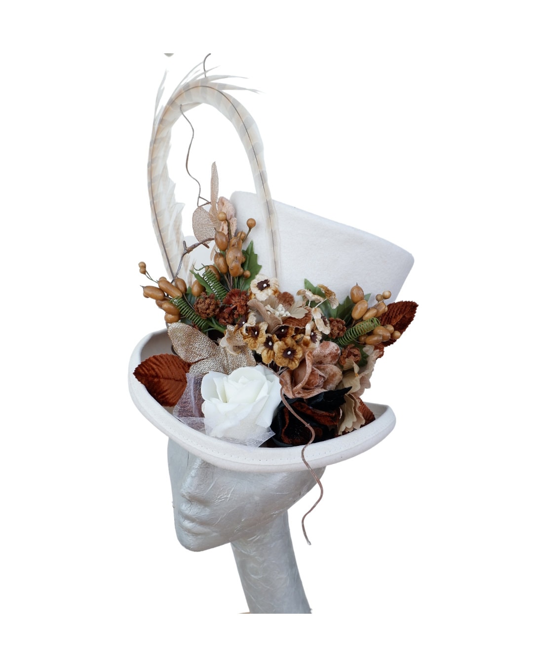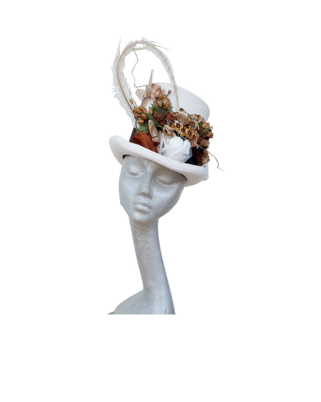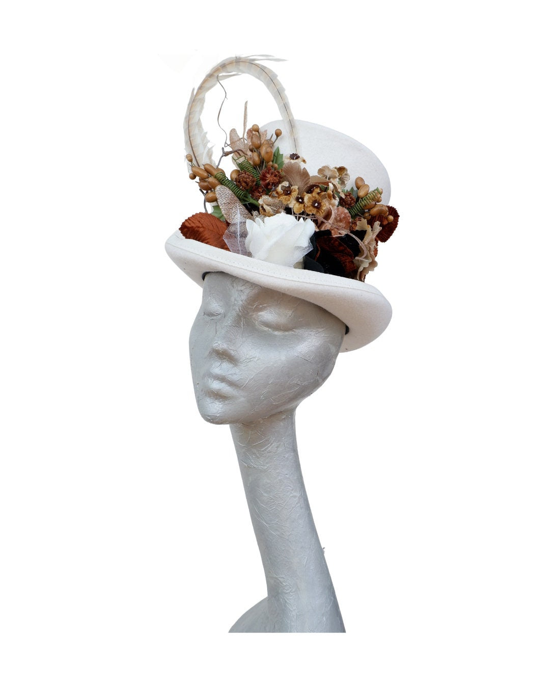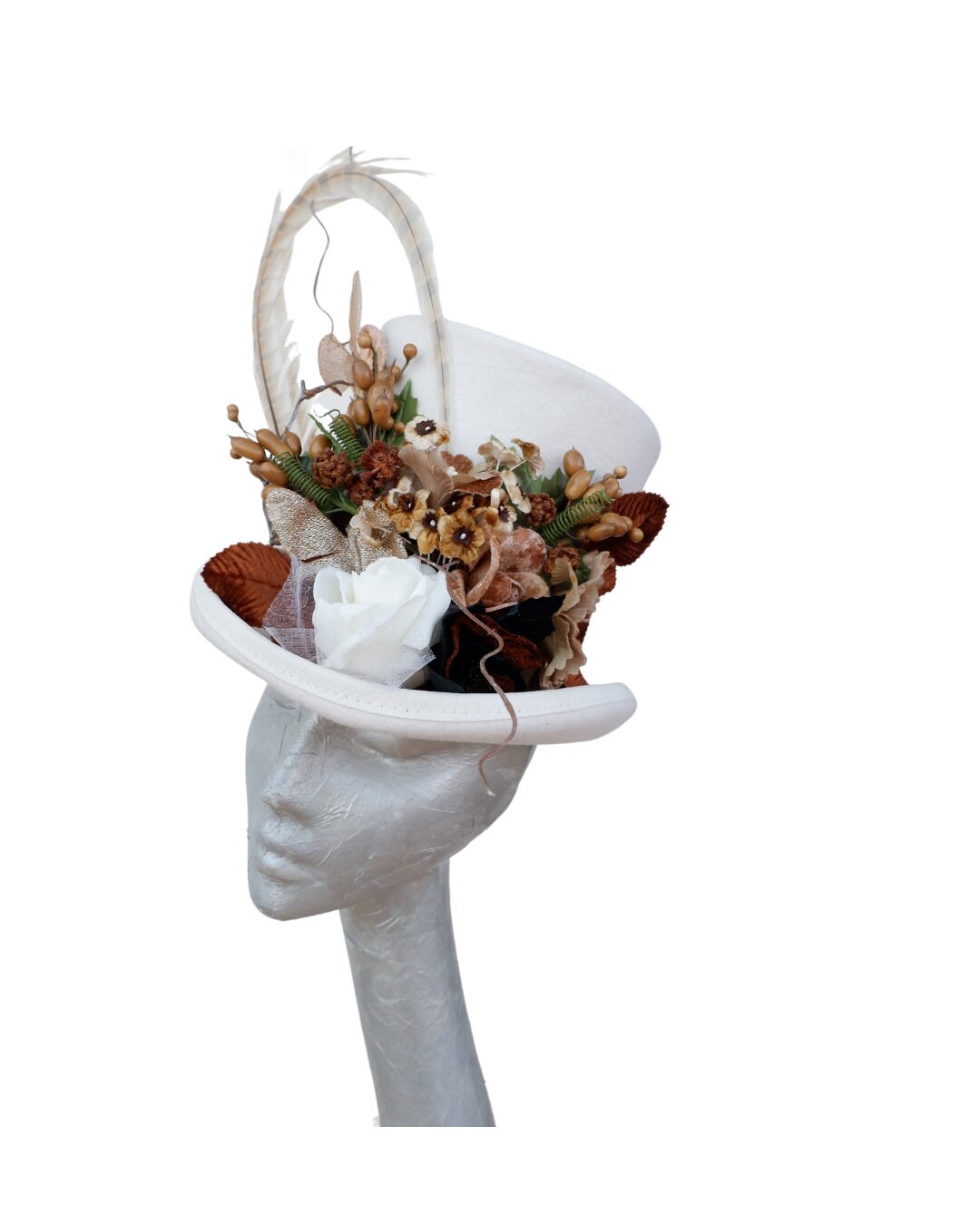 Beautiful Ivory Wool felt top hat trimmed with a wide brown grosgrain hat band dressed with velvet flowers and leaves, gold glittery butterflies twigs and with a long bleached pheasant feather making this a truly stunning statement piece.