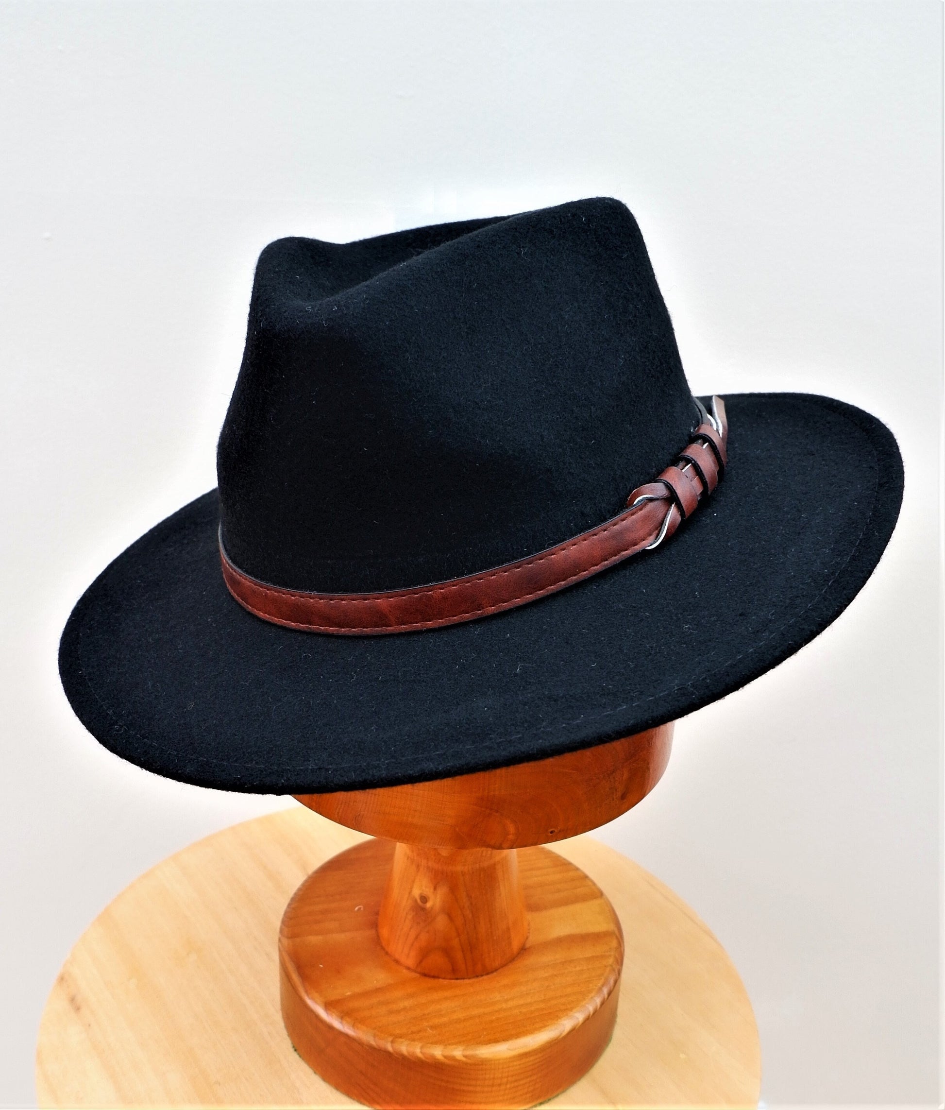 Gentlemans 100% Wool Black Fedora with brown Faux Leather trim superb quality. This can be made in Black only at present. Other Sizes can be made....