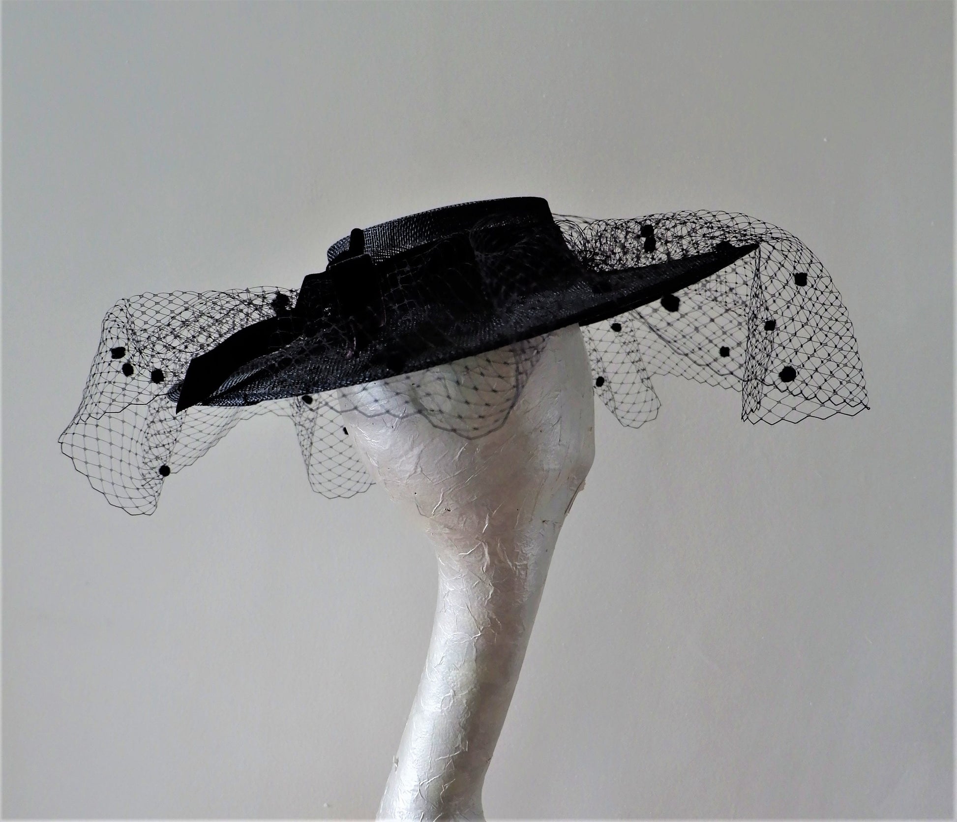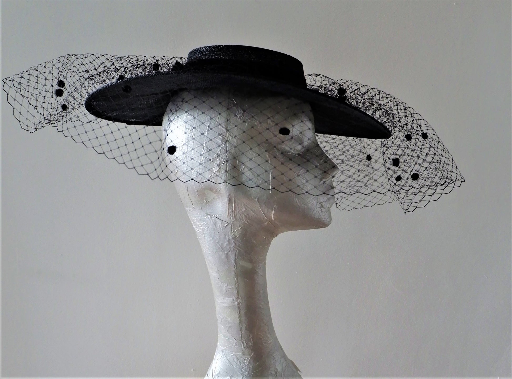 This is a stunning hat feature Spanish style boater in Black with a full merry widow veil . This style has been and still will be trending for the forth coming race season. Due to the shallow crown this does not sit over the head but is a perrcher style and sits on top of the head and has a hat elastic to help secure