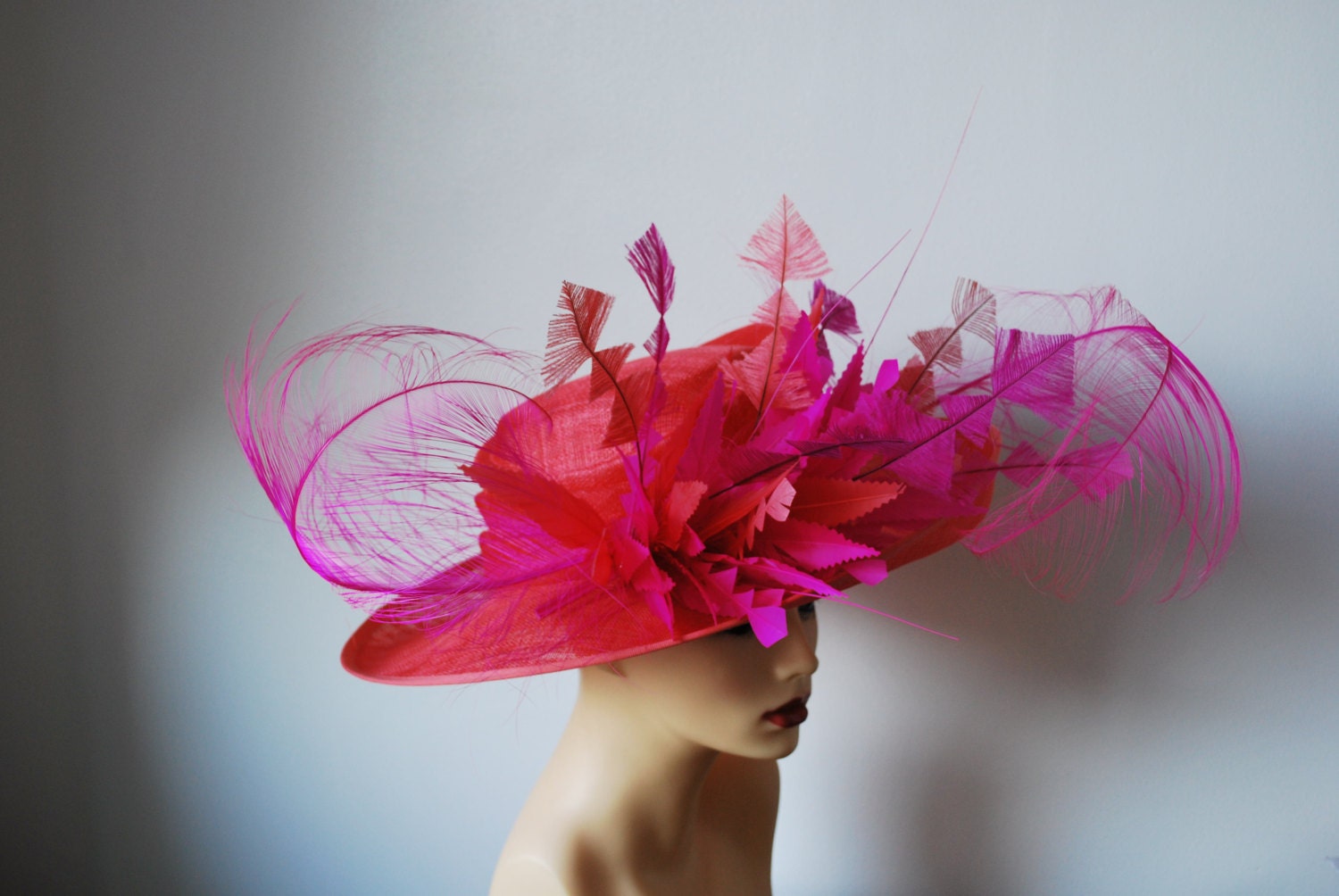 A stunning feature hat i Coral Orange & cerise using 2 curled burnt ostrich feathers, Ostrich chevron feathers and an array of pointed goose feathers adorn this amazing two tone hat with a adjustable hatband so you do not have to fear the hat slipping size 52cm to 58cm head size.Please note:- Handmade in the United Kingdom