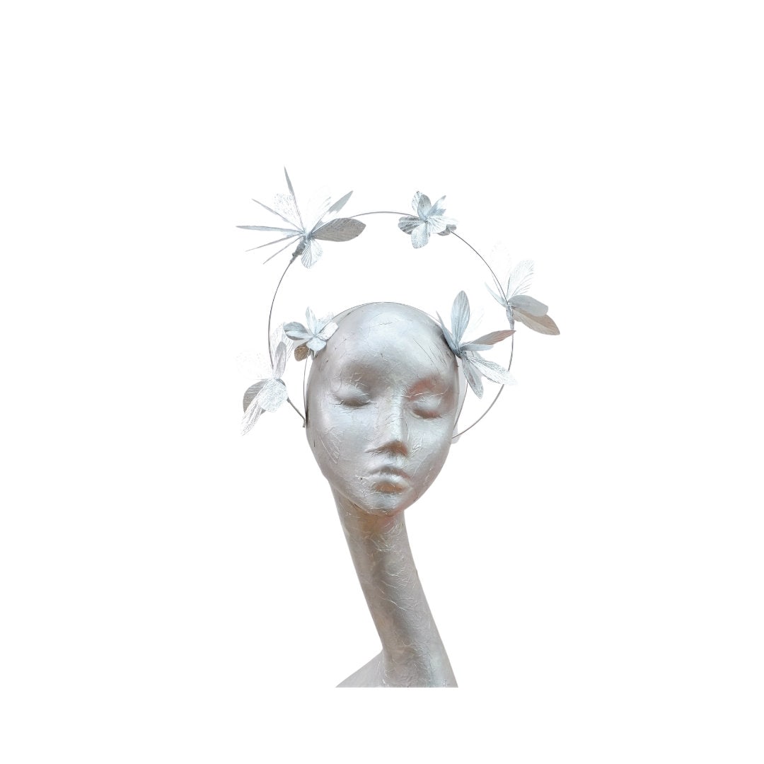 A beautiful delicate silver wire fascinator with silver metallic faux leather orchids attached to a Halo Alice band.Please note:- Handmade in the United Kingdom
