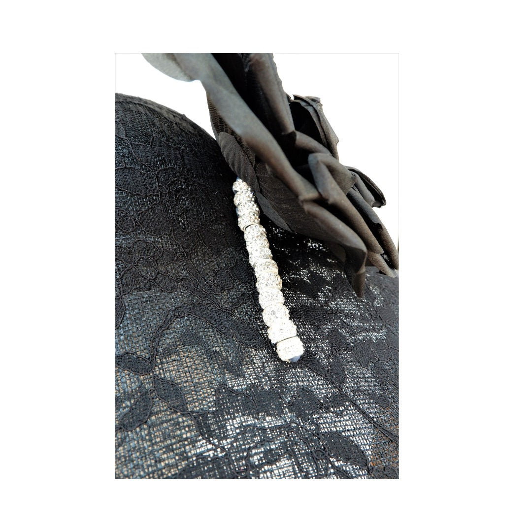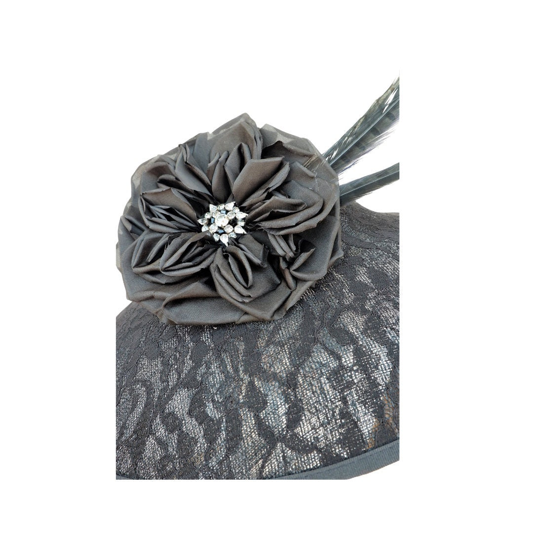 This is a beautiful lace covered sinamay coolie shaped hatinator with black silk flower with diamante and bead centre 2 black pheasant feathers attached to an hat elastic so you can position wherever y ou like one size fits all.