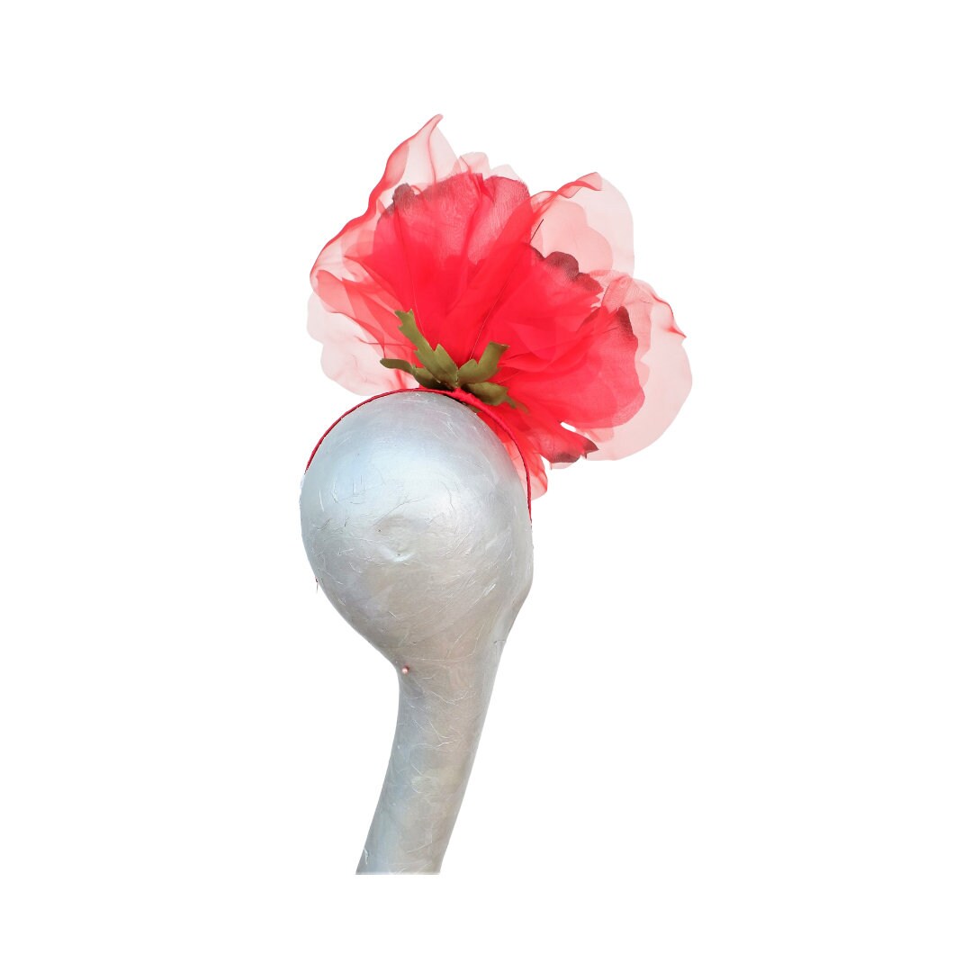 A 12" Silk & Organza Rose in Scarlet red tipped in black fascinator attached to a narrow red hairband
