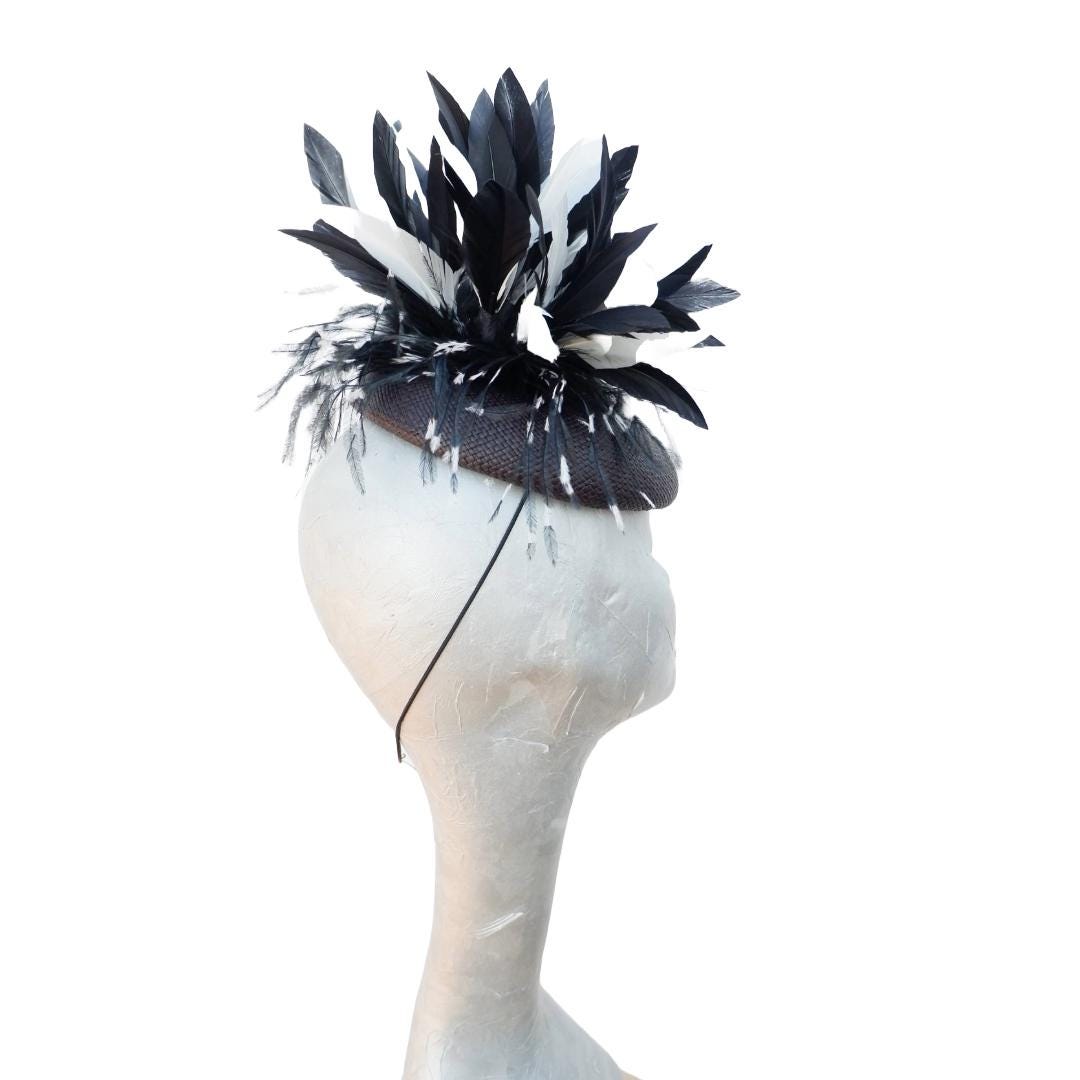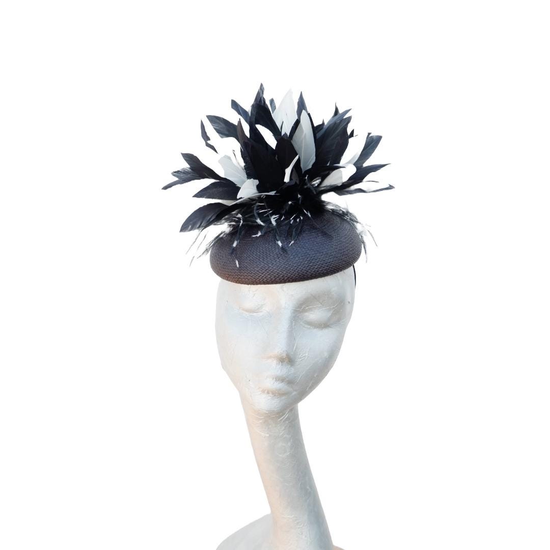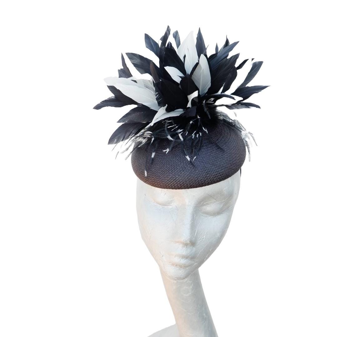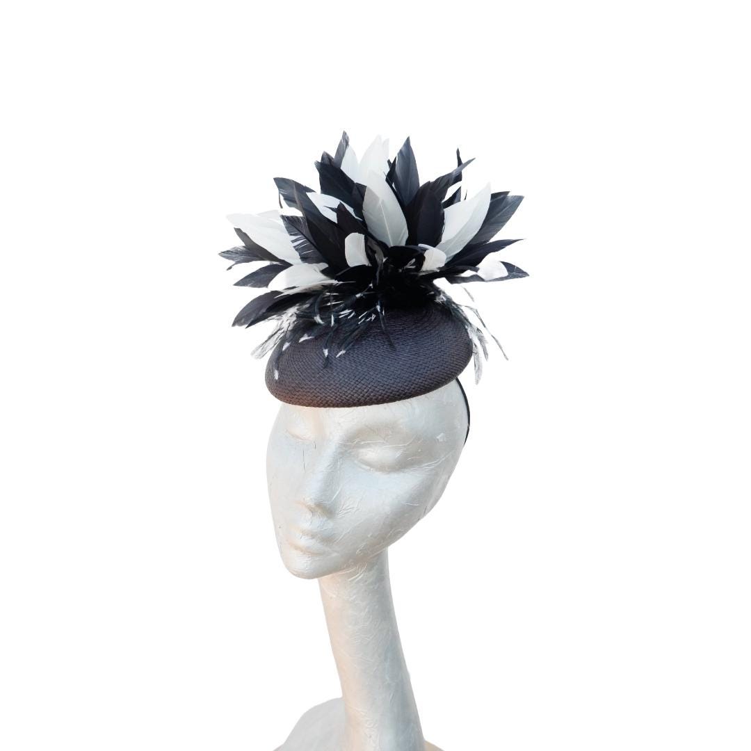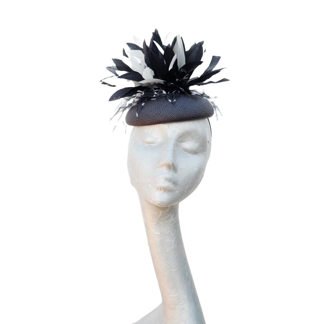 A stunning Black & White Button Base pillbox made from buntal with a black and white feather flower to the top with black and white ostrich feather boa to trim attached to a hat elastic so you can position anywhere on your head.. The fascinator does come supplied with a hat elastic NOT an Alice band.