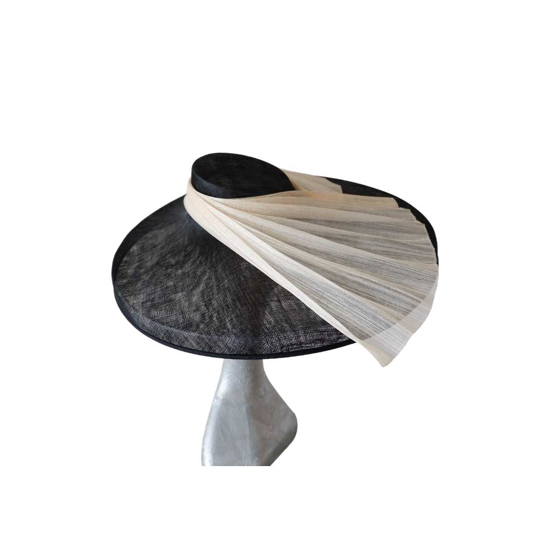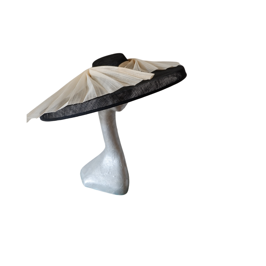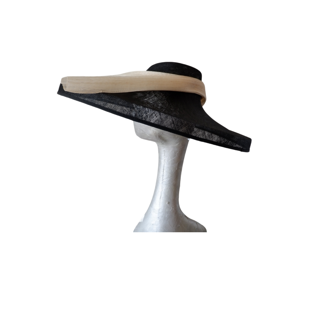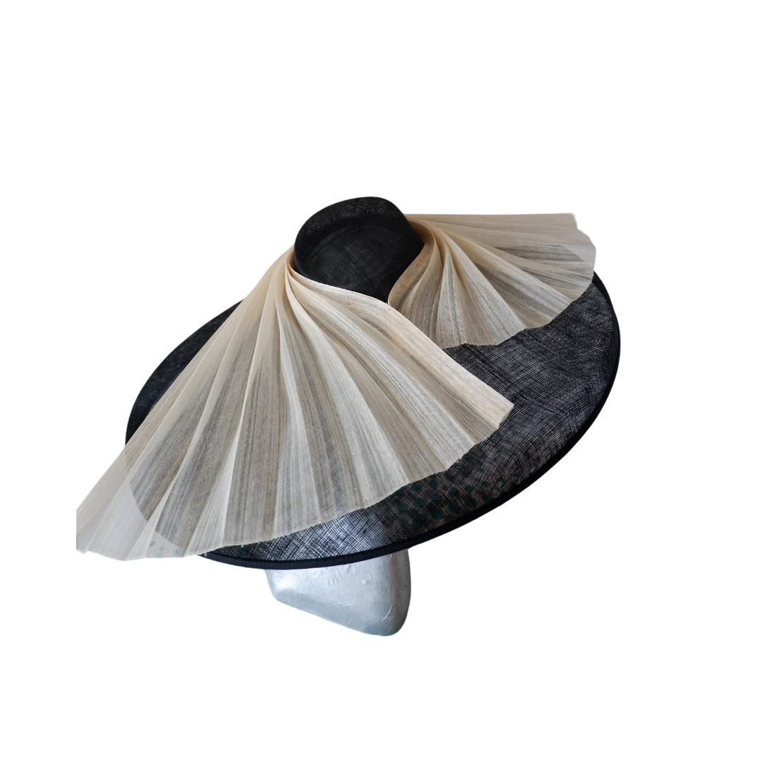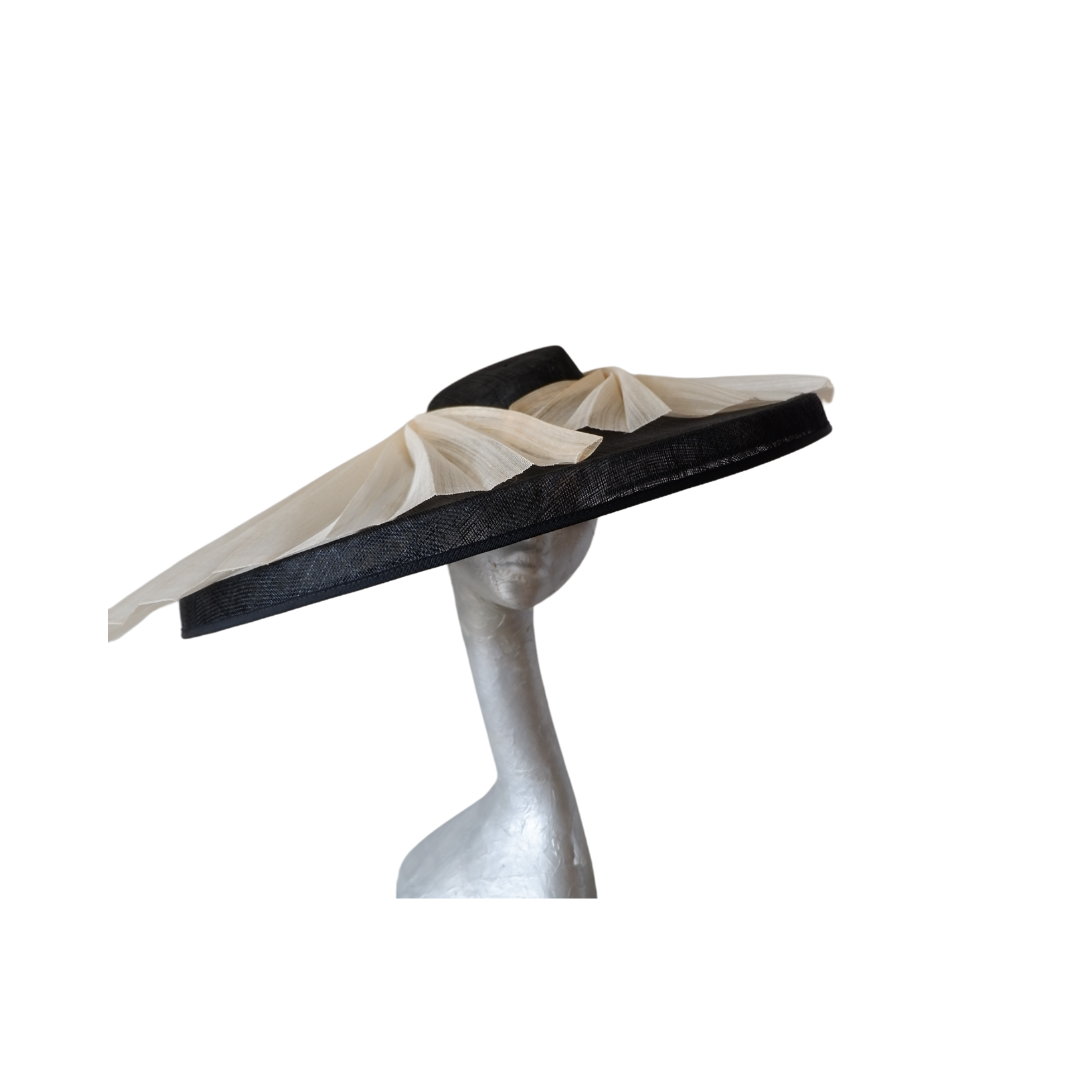 The most fabulous extra large feature hat in Black in black with a down turned lip to the brim it has a large silk abaca pleated sash in Ivory,