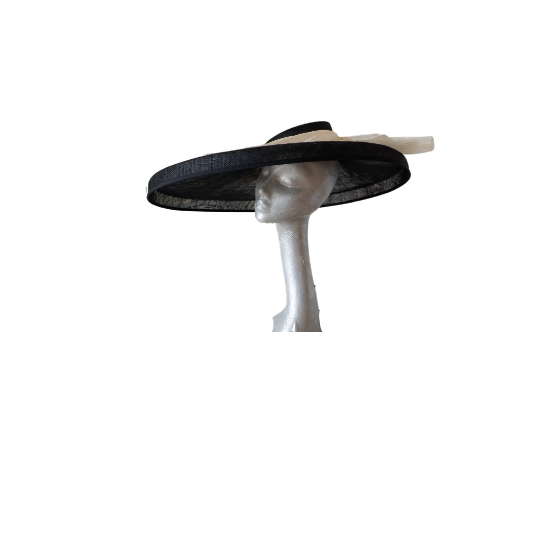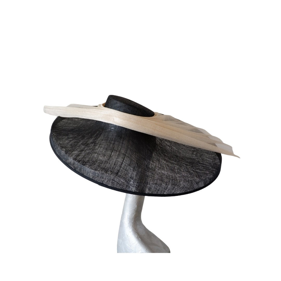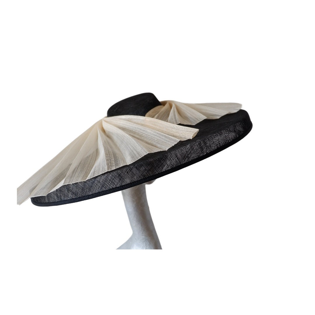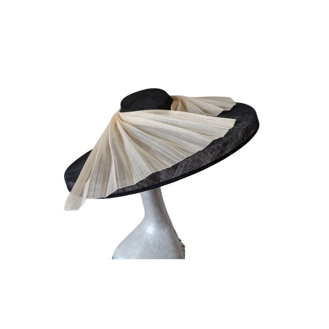 The most fabulous extra large feature hat in Black in black with a down turned lip to the brim it has a large silk abaca pleated sash in Ivory, The diameter of the brim is 54cm and fits any head size as its a percher style and comes with a hat elastic to keep it secure idea for any Mother of the bride or a stand out in the crowd piece at Ascot or the Kentucky Derby. This hat can be made in many more colours so please email me if you are interested in ordering another colour.