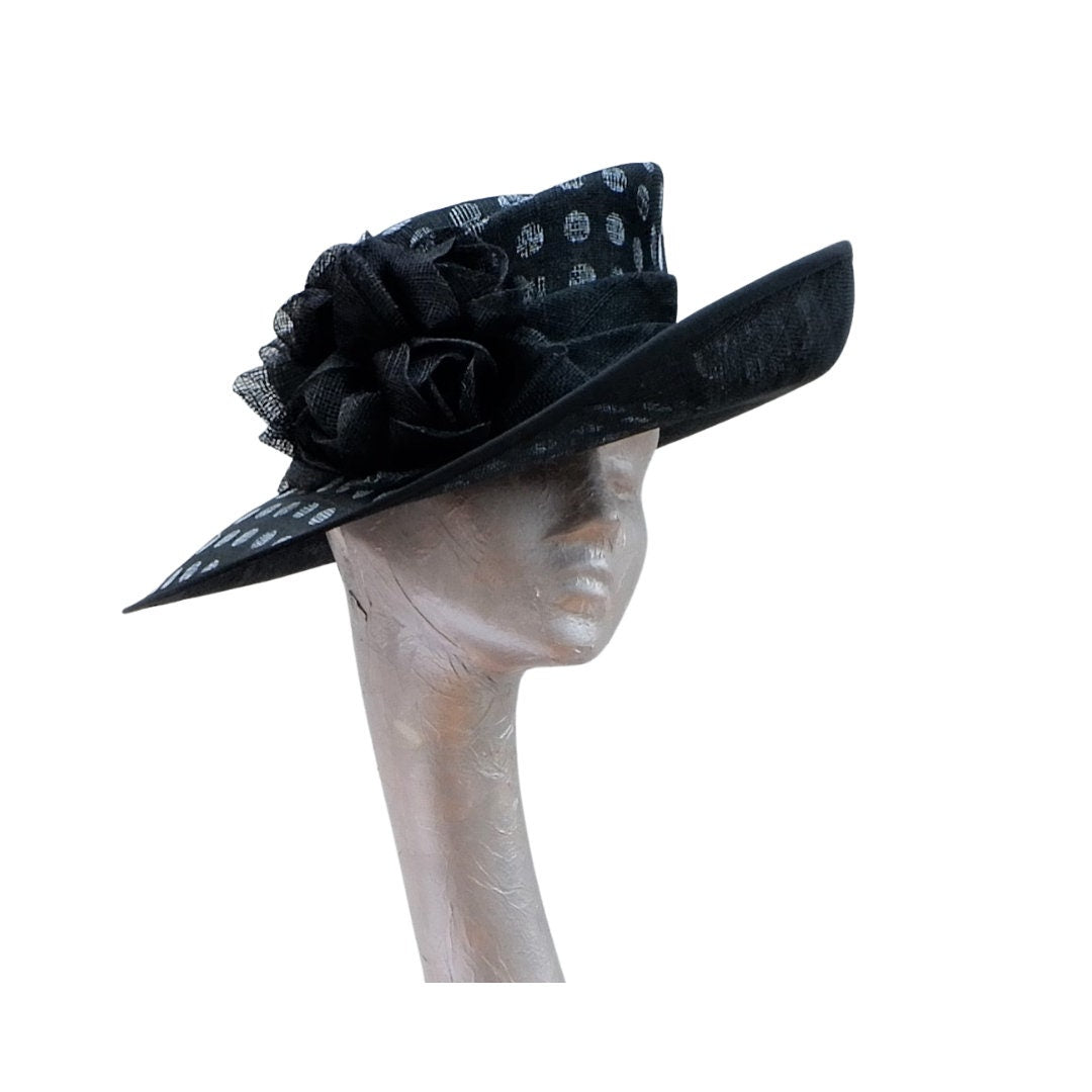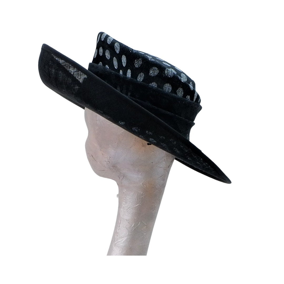 This beautiful shaped hat in black and white spotty sinamay with a sinamay black flower to trim the front. Tha hat has an adjustable internal hat band so you can downsize for a snug comfortable fit.