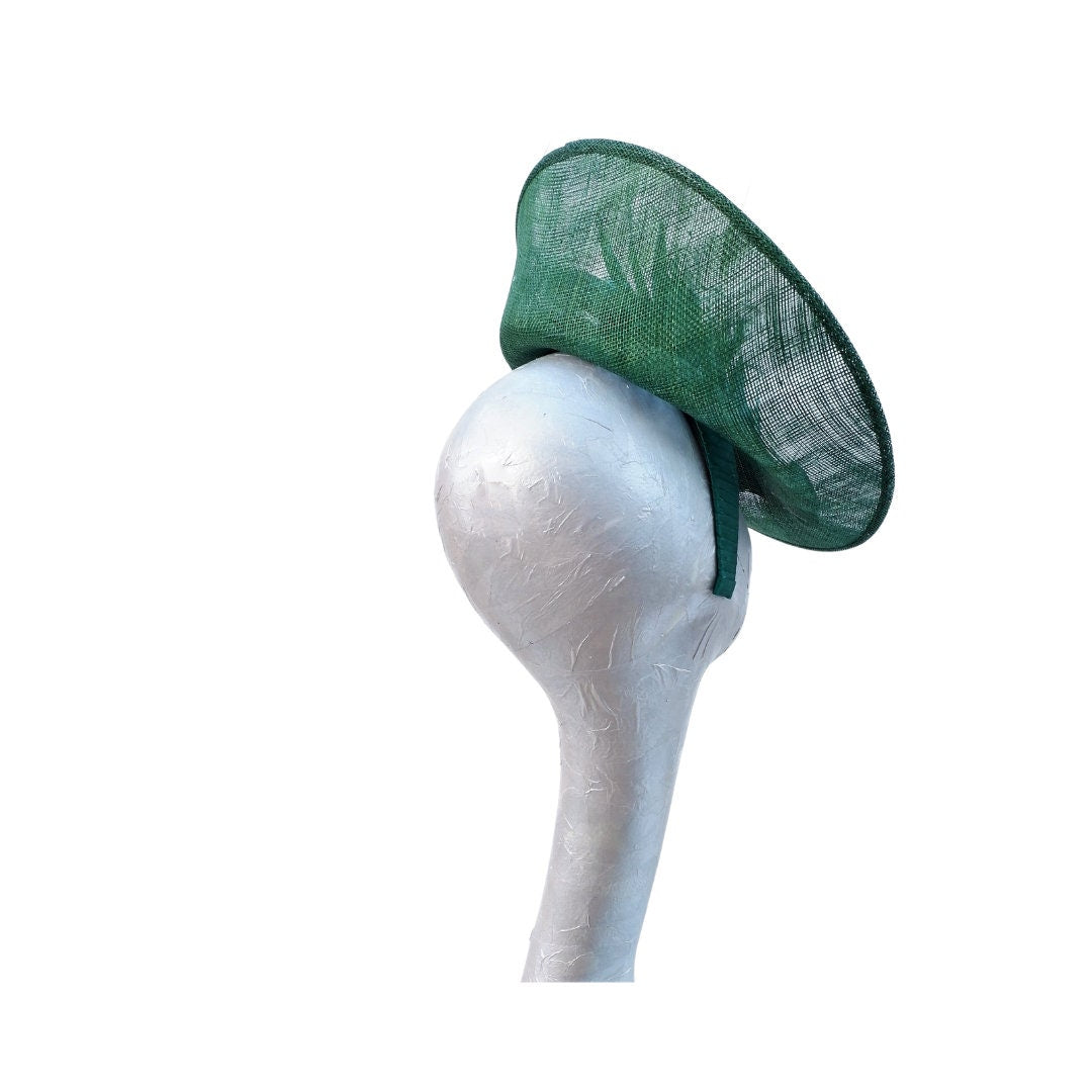 A Dark Emerald green two tone Sinamay upturned fascinator with matching feather trims attached to a satin covered Alice band