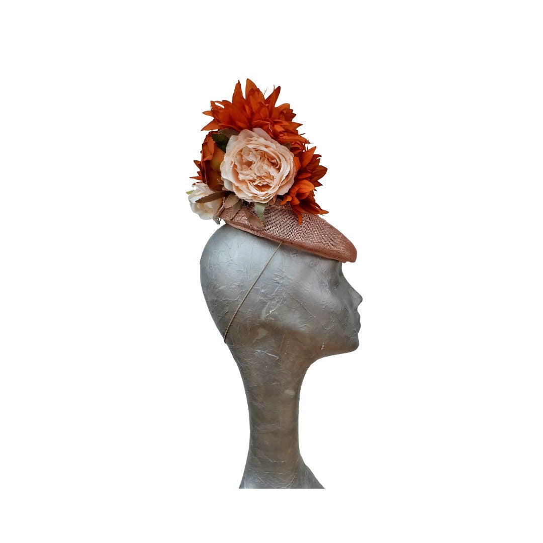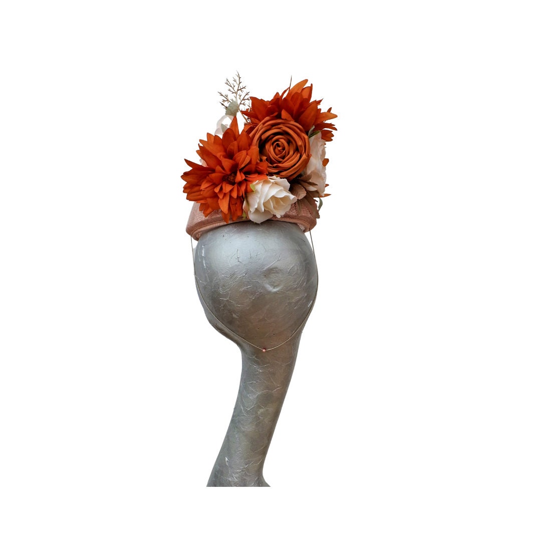 A stunning Blue sloped pillbox adorned with a mass of silk artificial flowers in Burnt orange, Ivory with a touch of Gold Fern.