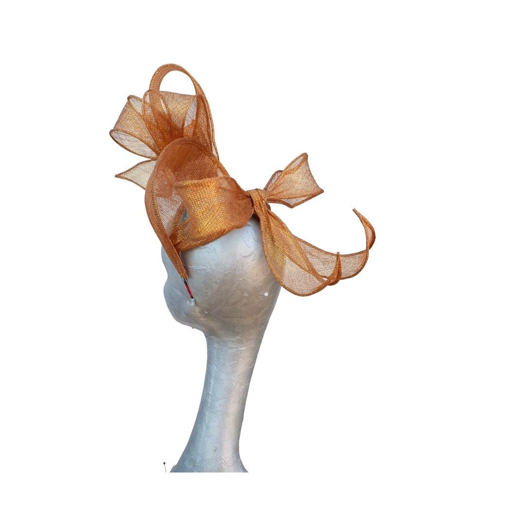 This is a stunning Toffee sinamay with a gold lurex thread running through this duchess style headband with sinamay loop detail to the front and a bow to the rear.