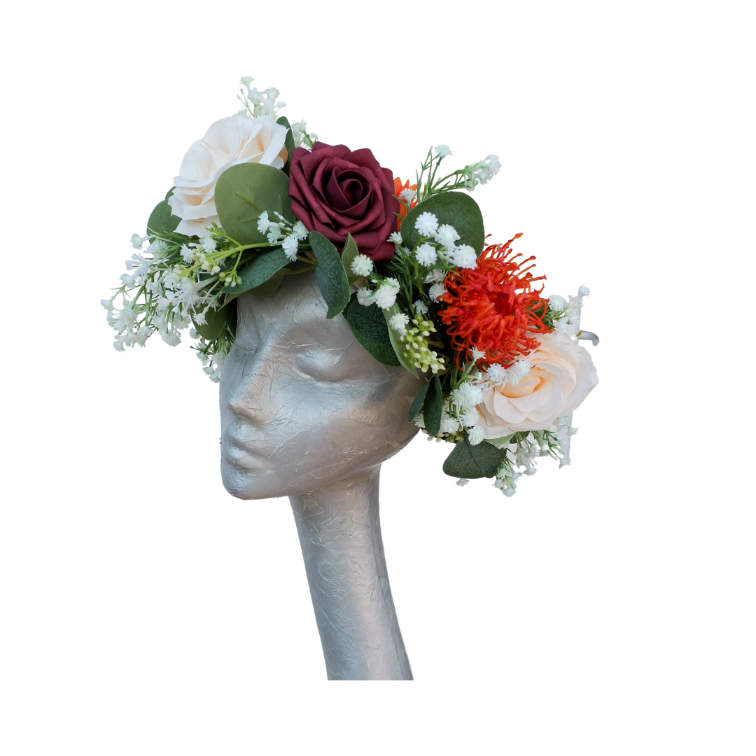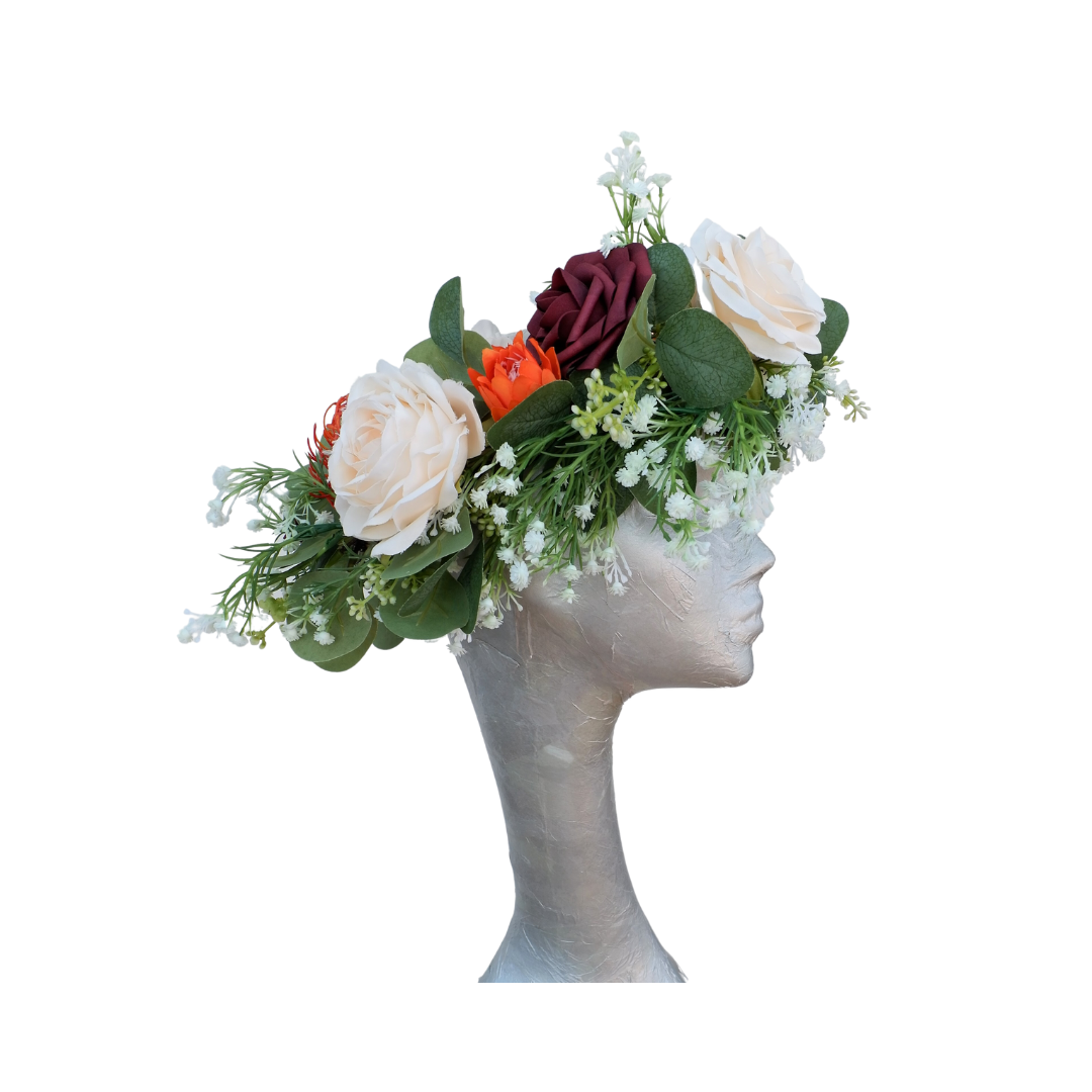 This is a beautiful handmade floral crown in artificial flowers, masses of eucalyptus leaves, gypsophile, Burgundy foam roses, ivory silk roses, orange silk lotus flower and orange protea attached to a raffia circle crown. This can be made in many different colors. Please note:- Handmade in the United Kingdom Buyers outside of the UK may need to pay customs fees or duties, which vary from country to country. Also, customs can sometimes delay delivery by many days. We want buyers to know that any customs delays are not our fault. For Orders that are refused at delivery, Not in to sign or not collected from the sorting office/post office or Incorrect addresses provided will not be refunded but an extra postage cost will be invoiced to have the order re-delivered. All items are made to order please note that all millinery is exempt from the returns and refunds policy in in the unlikely event that a return is accepted then original postage cost will be deducted. due to the nature of feathers and fabrics sometimes the feathers may fall differently i always endeavour to get the exact same formation as the original photo but sometimes it is not possible so a close match will be made. Due to different monitors and devices resolutions some colours may look different from screen to screen please ask for a colour sample if you are not sure.