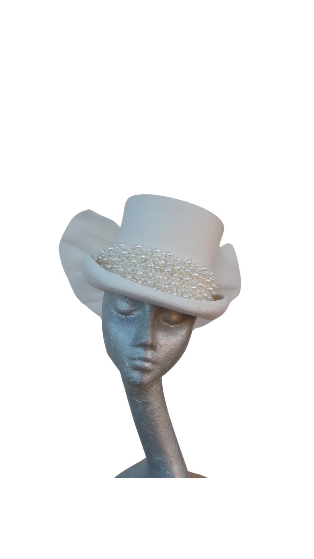 Beautiful Ivory Wool felt top hat trimmed with a wide pearl & organza hat band dressed with a large organza stiff bow and tails to the rear making this a truly stunning statement piece.