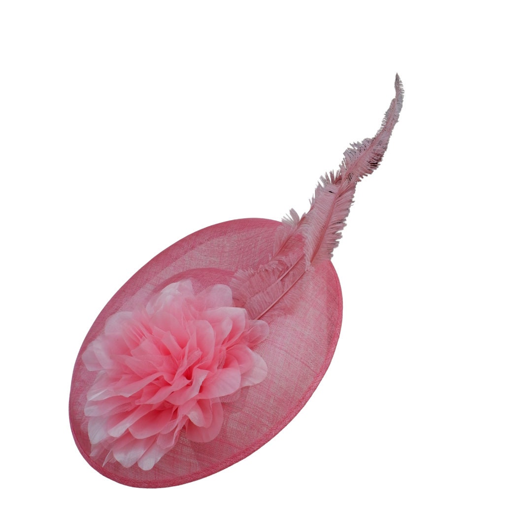Beautiful round 50cm sinamay hatinator with a large 10" organza flower with 3 extra long twisted ostrich feathers attached to an Alice band for a secure fit.Please note:- Handmade in the United Kingdom