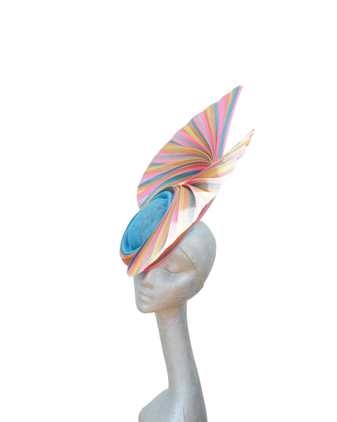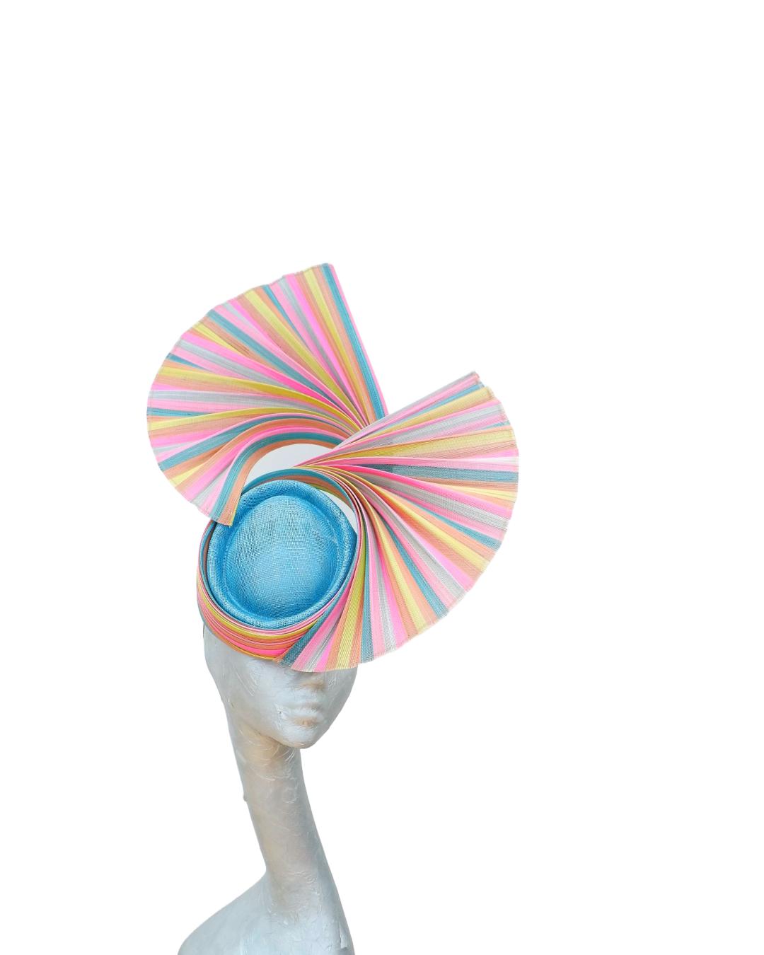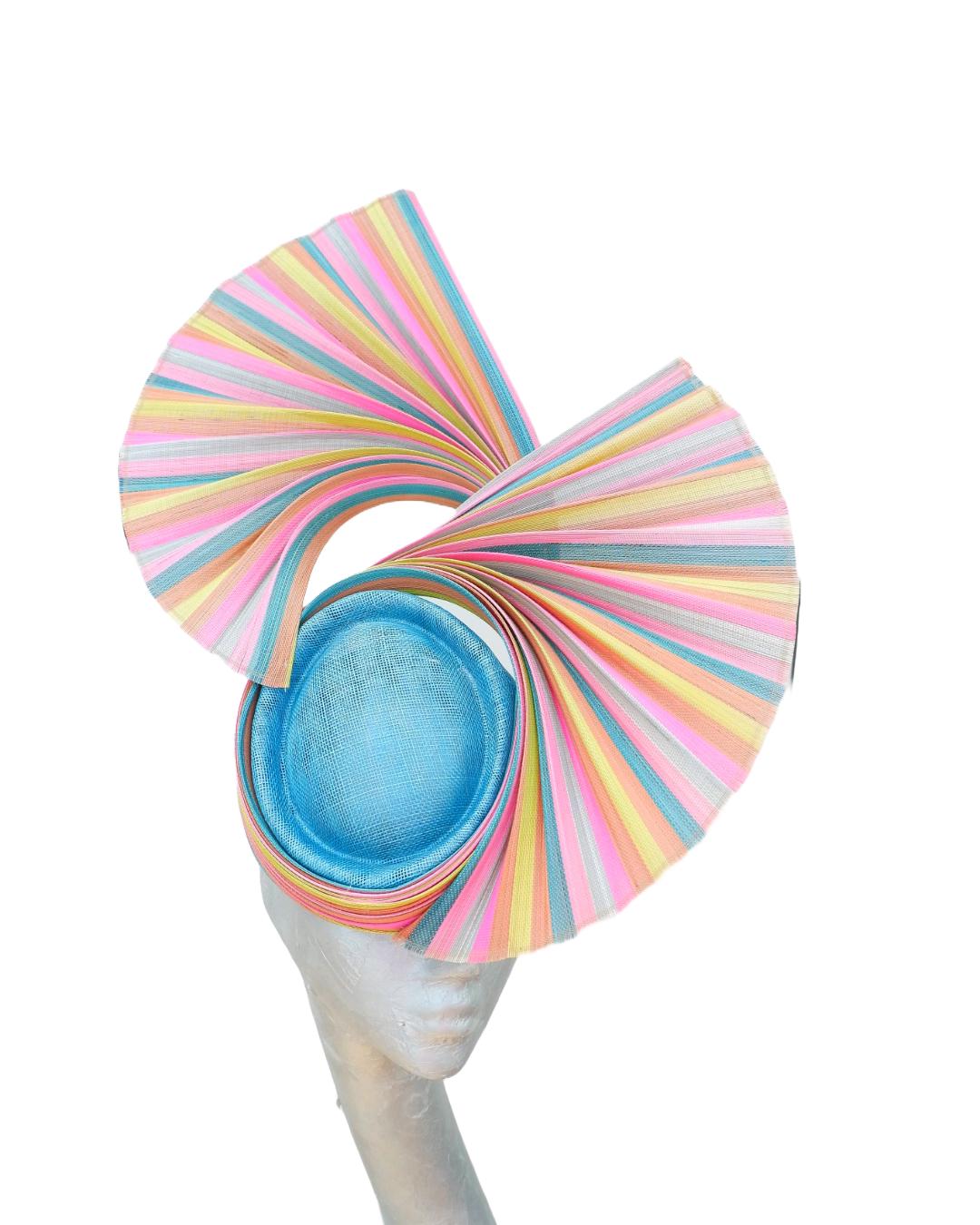 This is a stunning Turquoise Rolo pillbox in Sinamay with a Rainbow Jinsin Buntal fan detail secures with a hat elastic