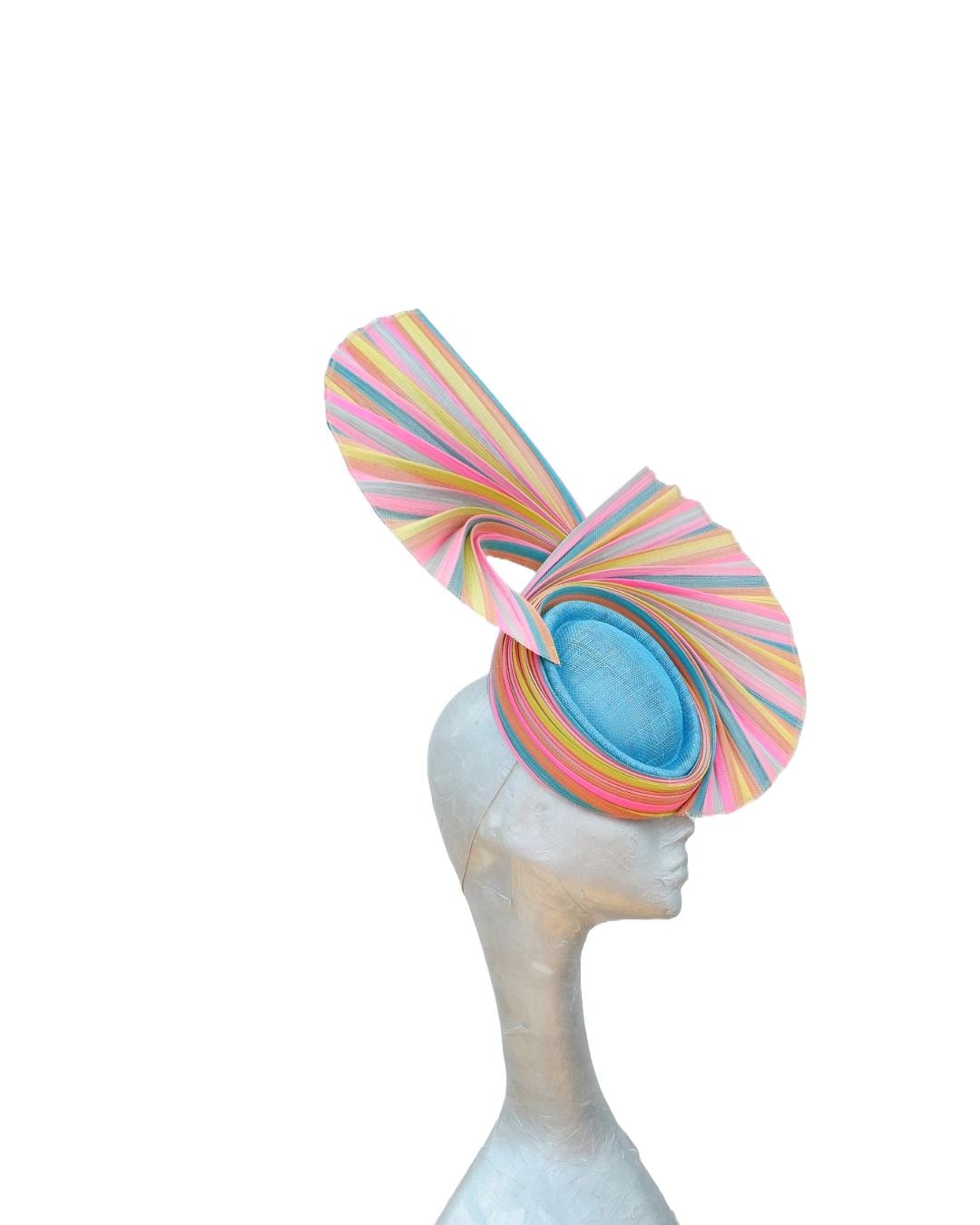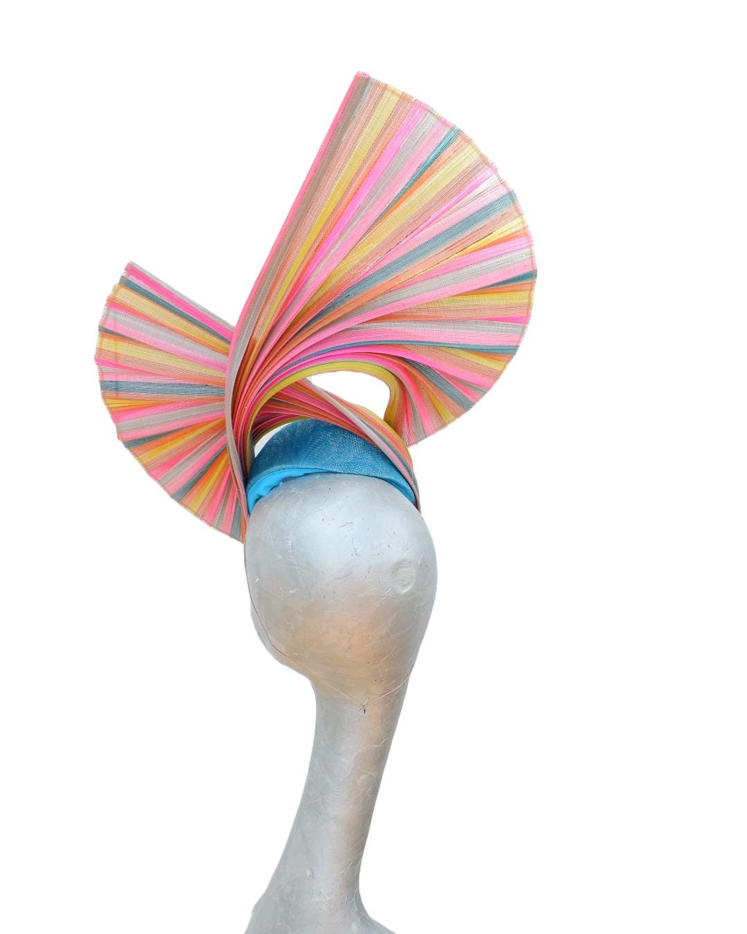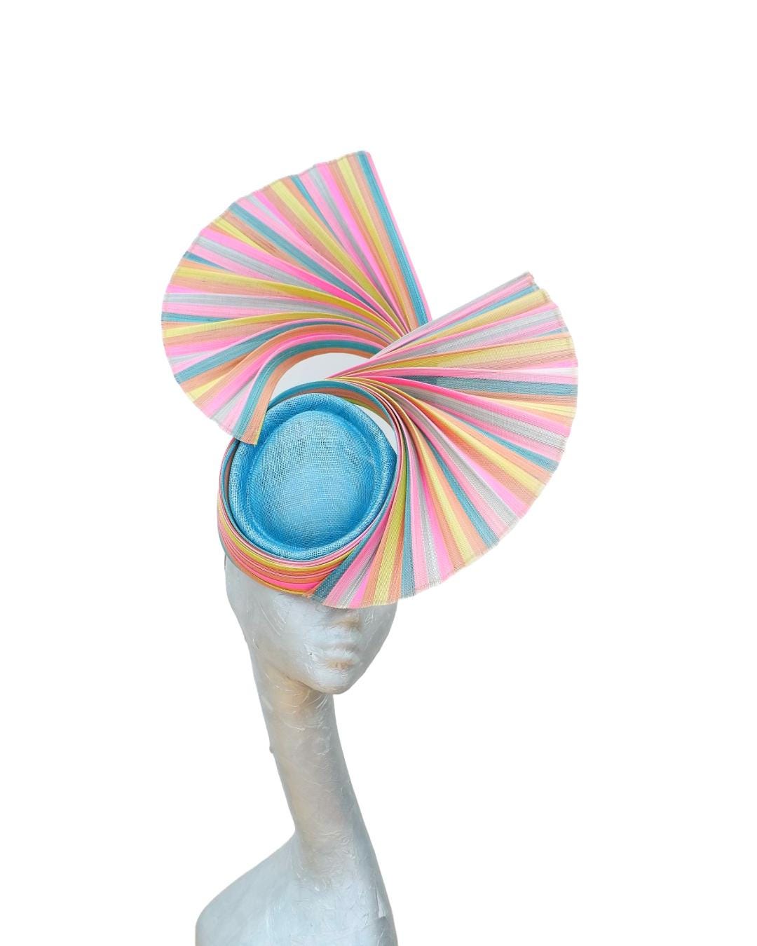 This is a stunning Turquoise Rolo pillbox in Sinamay with a Rainbow Jinsin Buntal fan detail secures with a hat elastic