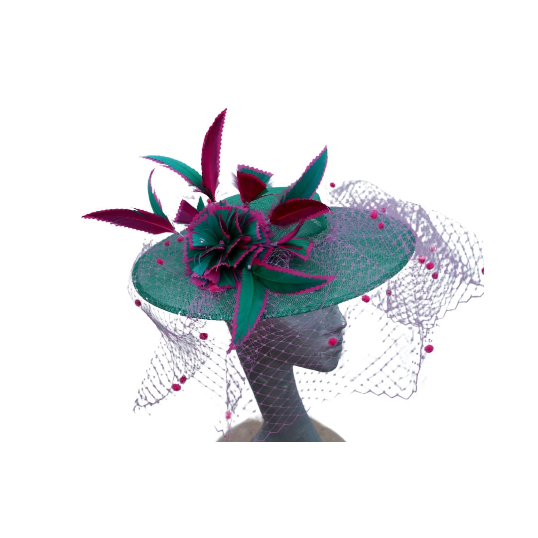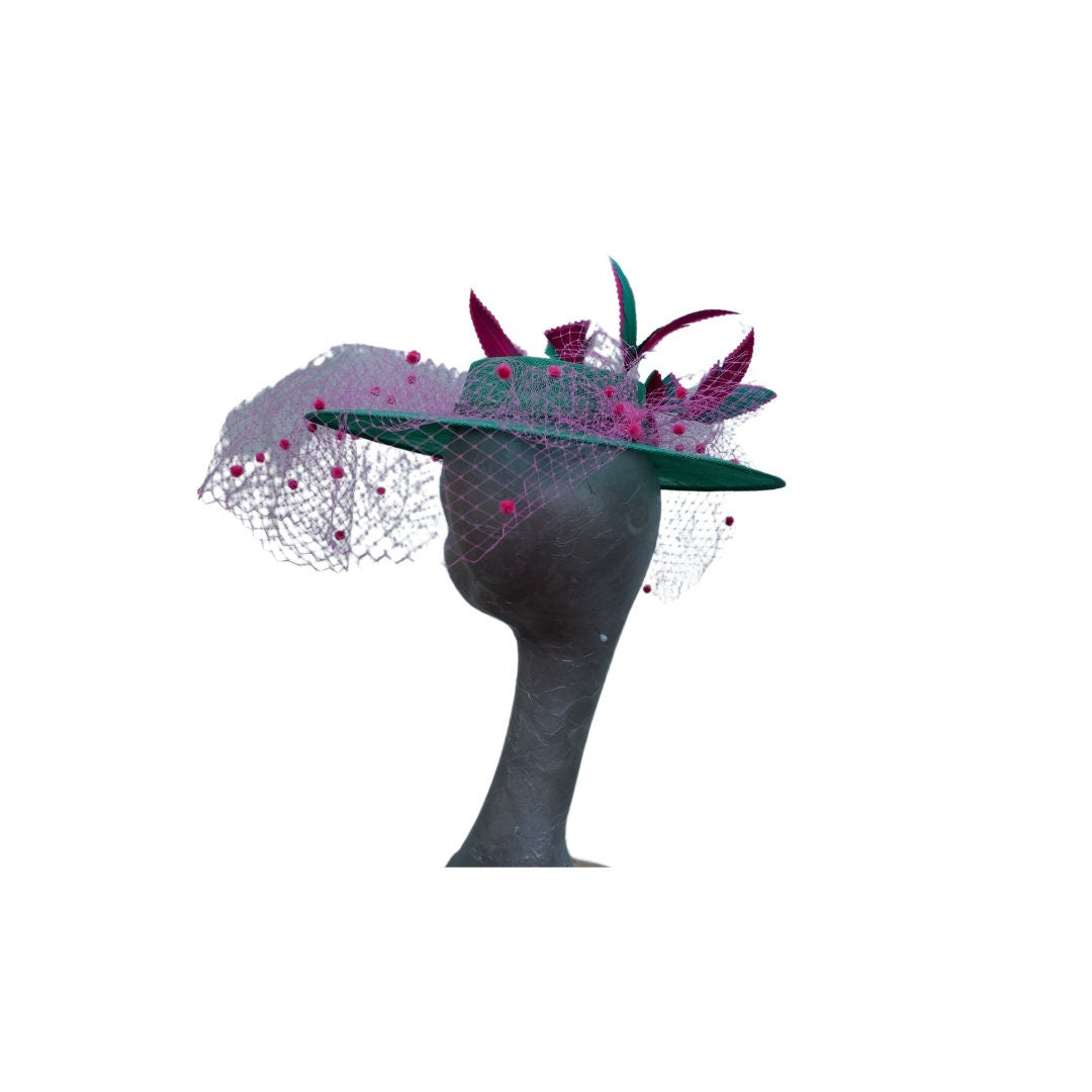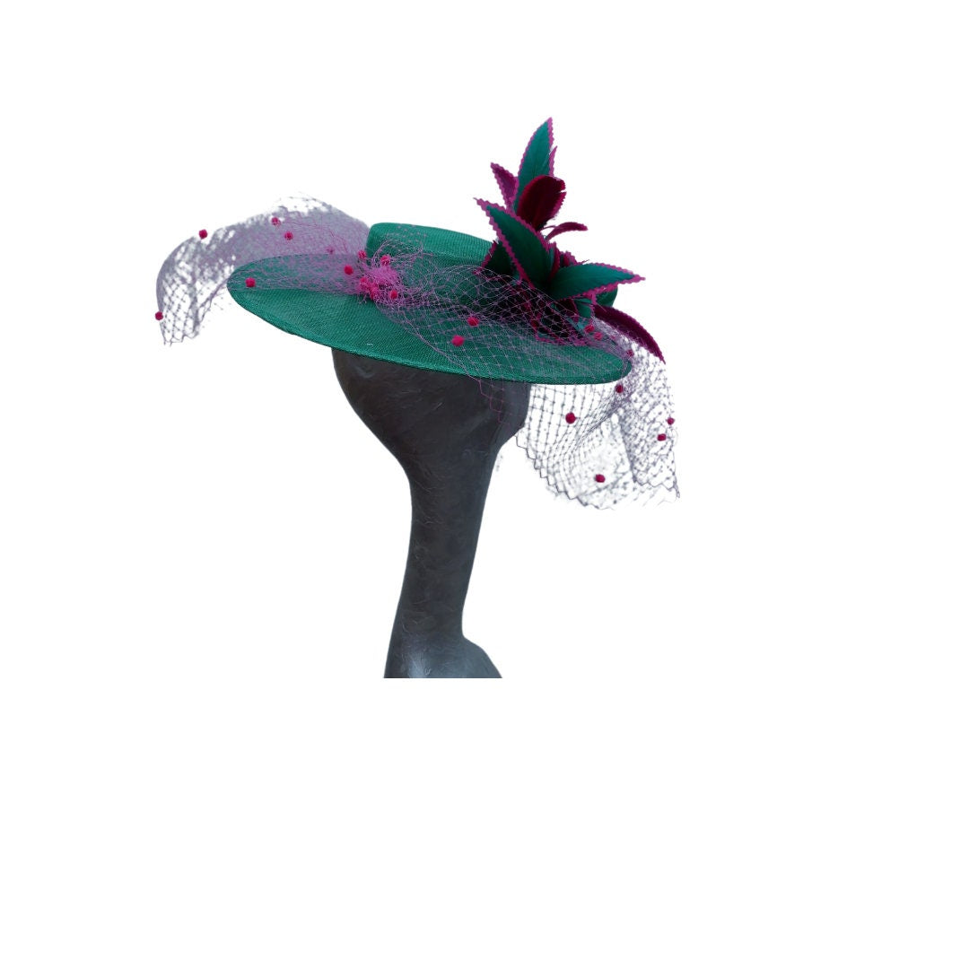 This is a stunning hat feature Spanish style boater in Emerald green with hot pink feather flowers and merry widow veil with pink chenille dots . This style has been and still will be trending for the forth coming race season. Due to the shallow crown this does have a hat elastic to help secure