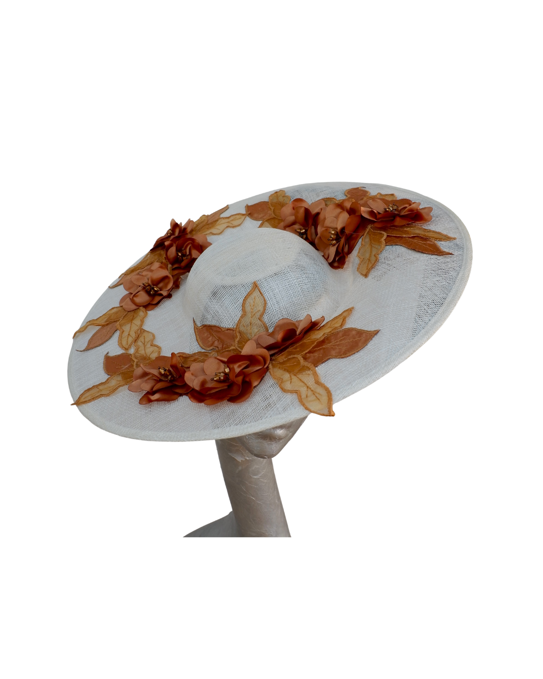 Beautiful round 43cm Ivory sinamay saucer fascinator with a with Dark Gold applique detail making this a truly elegant and stunning piece. Attached to an Alice Band