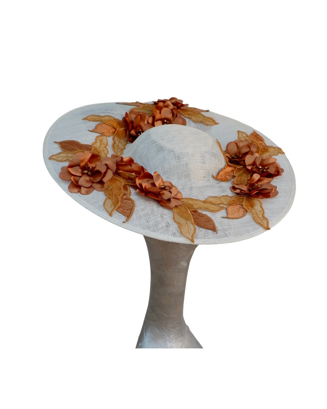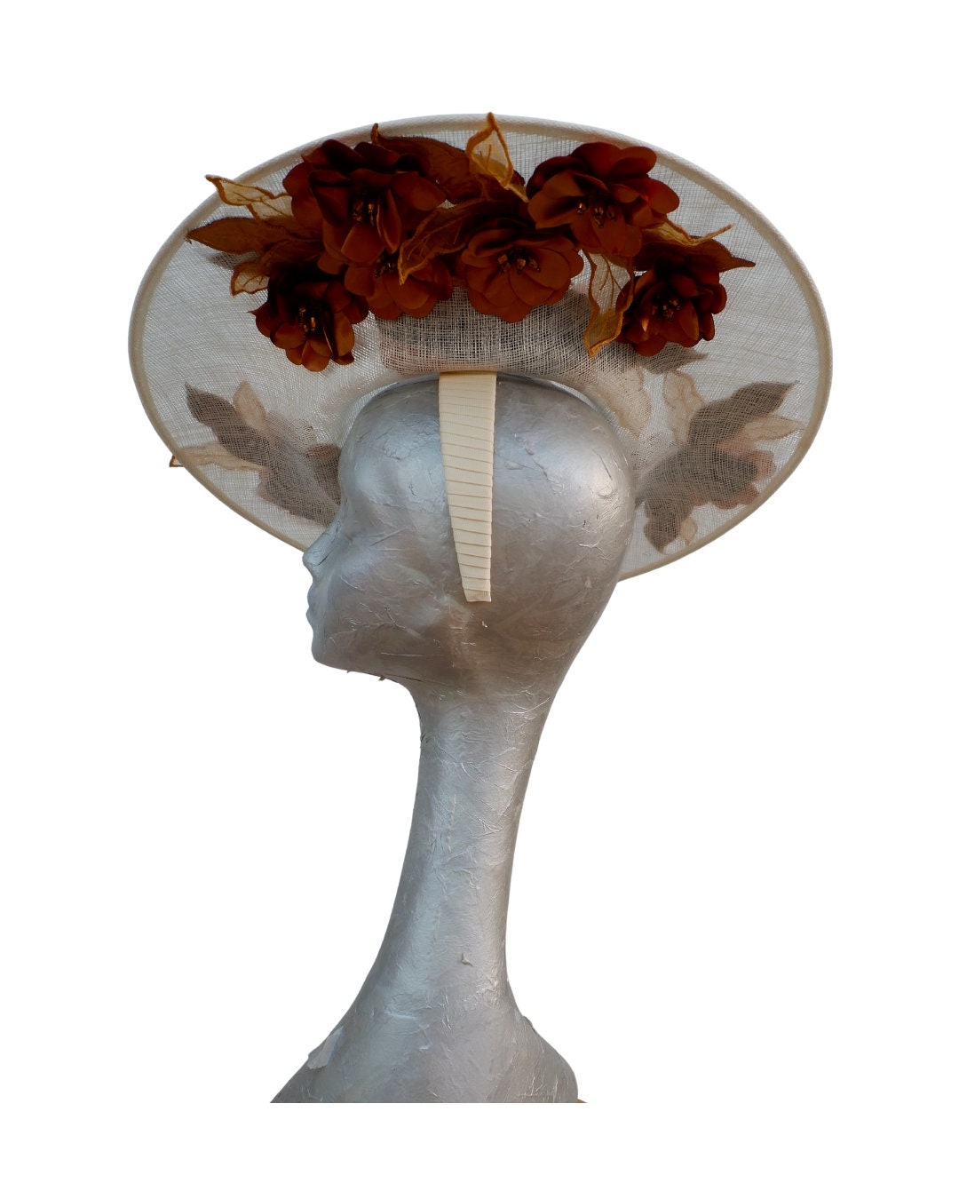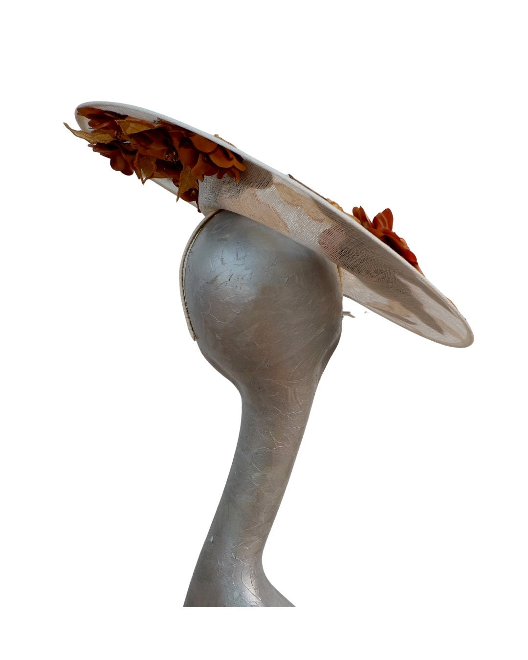 Beautiful round 43cm Ivory sinamay saucer fascinator with a with Dark Gold applique detail making this a truly elegant and stunning piece. Attached to an Alice Band