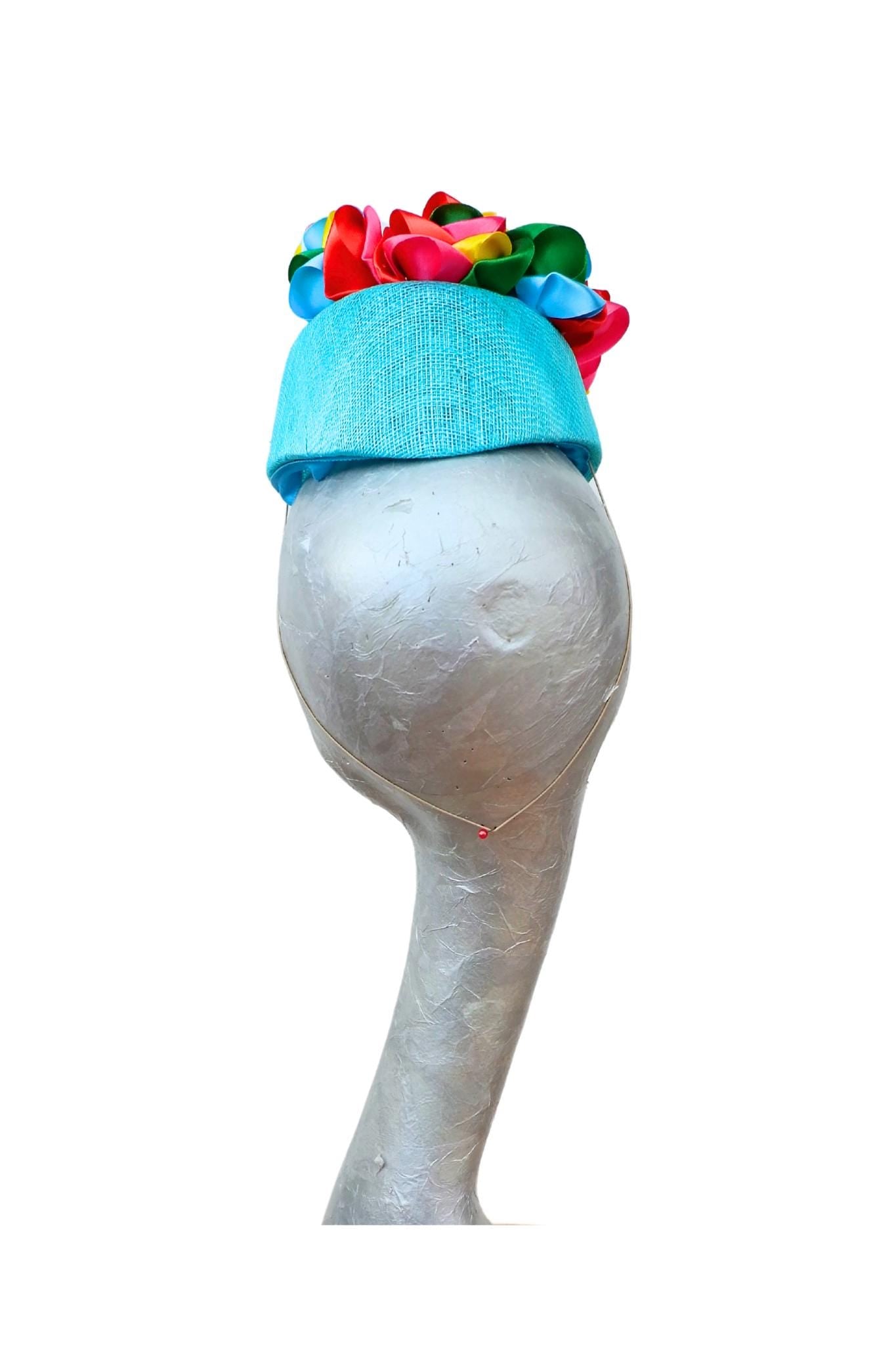 A stunning Turquoise Pillbox trimmed with handmade rainbow ribbon roses attached to a hat elastic so you can position anywhere on your head.. The fascinator does come supplied with a hat elastic NOT an Alice band.