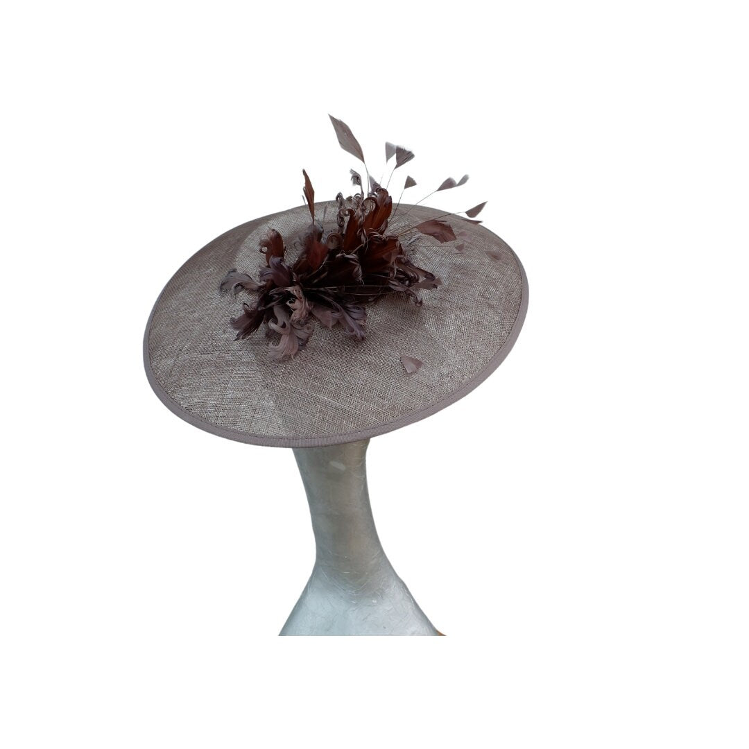This is a stunning Taupe & Mocha oval hatinator with curled feather plume trim attached to an Alice band for security.