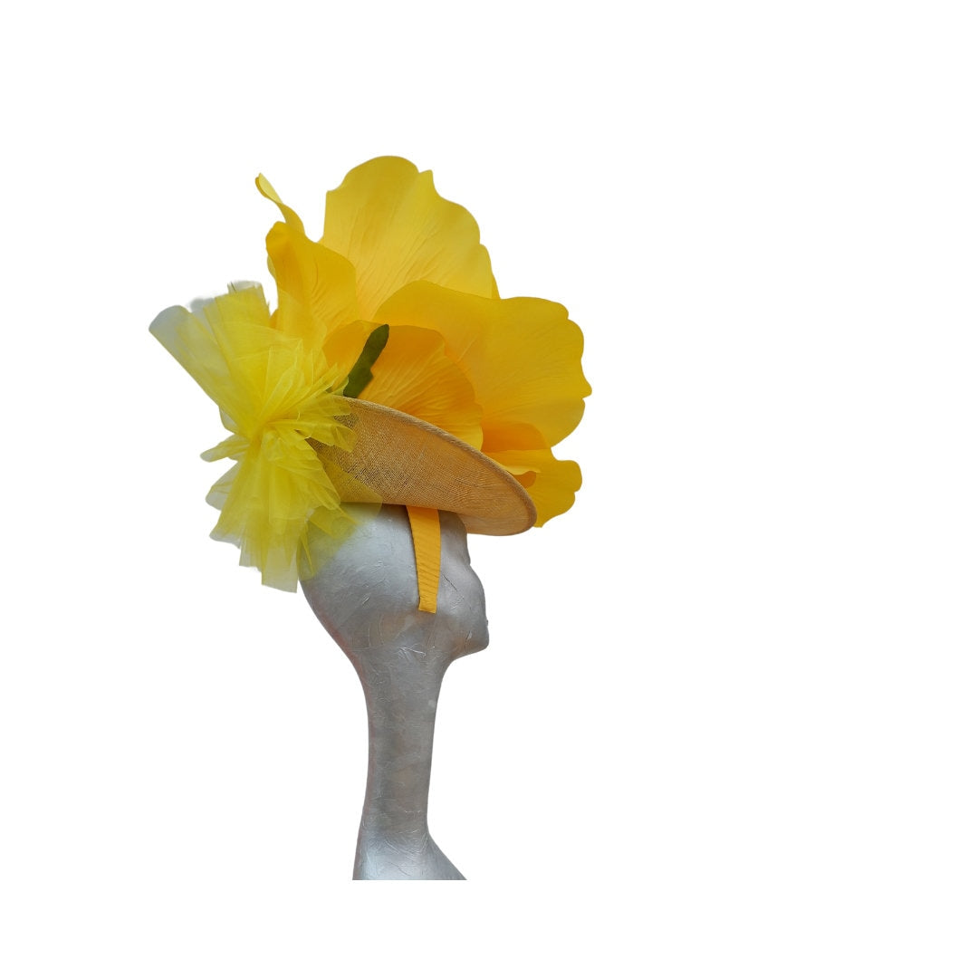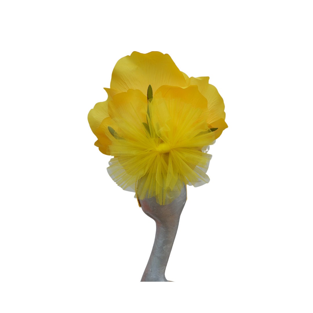 This the largest ever Yellow rose fascinator headpiece made to a whopping 50cm diameter and 50cm in height larger than any dinner plate attached to a medium sized sinamay base with a hot pink chiffon ruffle to the back . The fascinator is secured with a wide fabric covered Alice band and comb as these are a heavier piece due to the size . I have been making these for a very long time as it was originally designed for the 2016 Hats2go Show piece and i have been making this popular style ever since