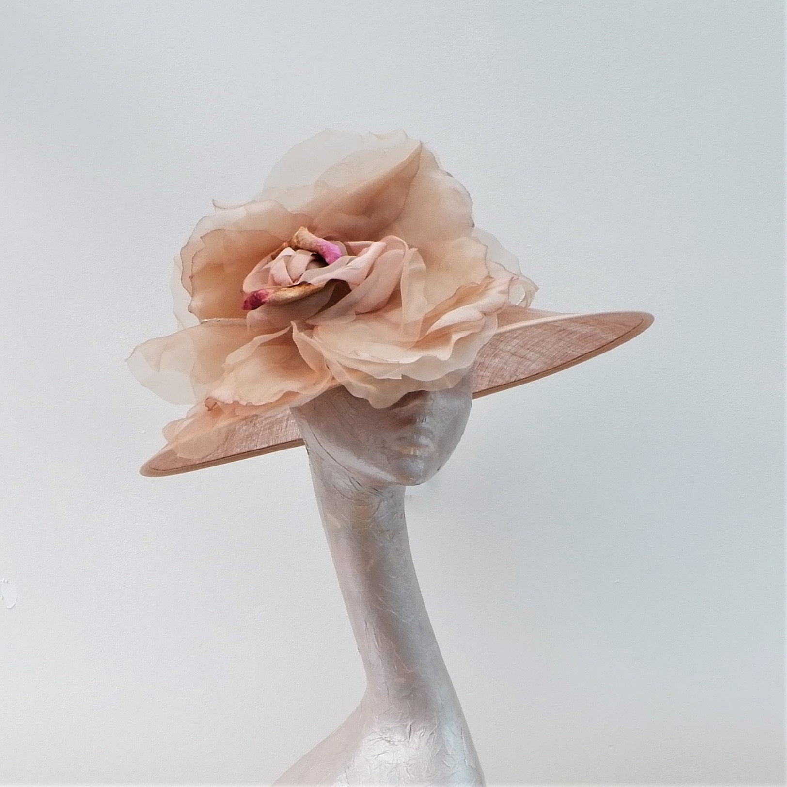 A beautiful feature wedding/ races hat in a modern timeless style with the oval shaped brim trim with the most amazing 12" Silk organza rose with a velvet centre. The Hat itself has an internal Hatband so the hat can be Downsized for a secure fit.