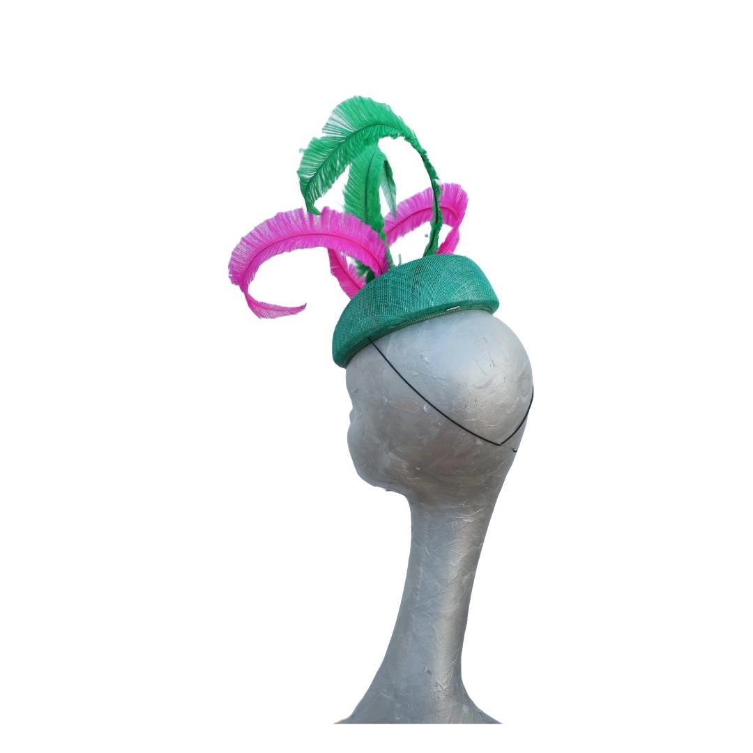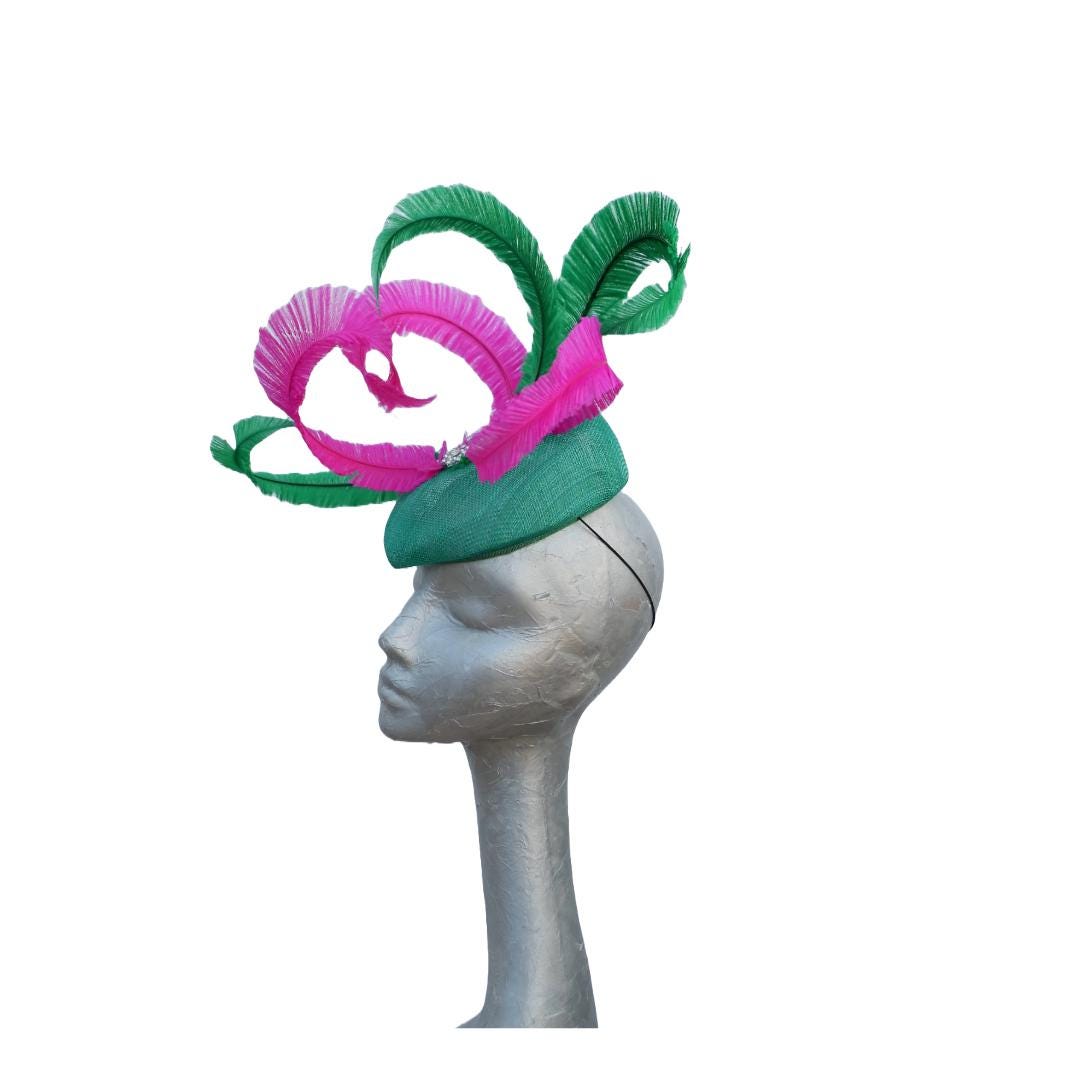 A stunning Emerald pillbox In Emerald Green sinamay with Emerald & Hot Pink Trimmed & curled Ostrich feathers Feather attached to a hat elastic so you can position anywhere on your head.. The fascinator does come supplied with a hat elastic NOT an Aliceband.