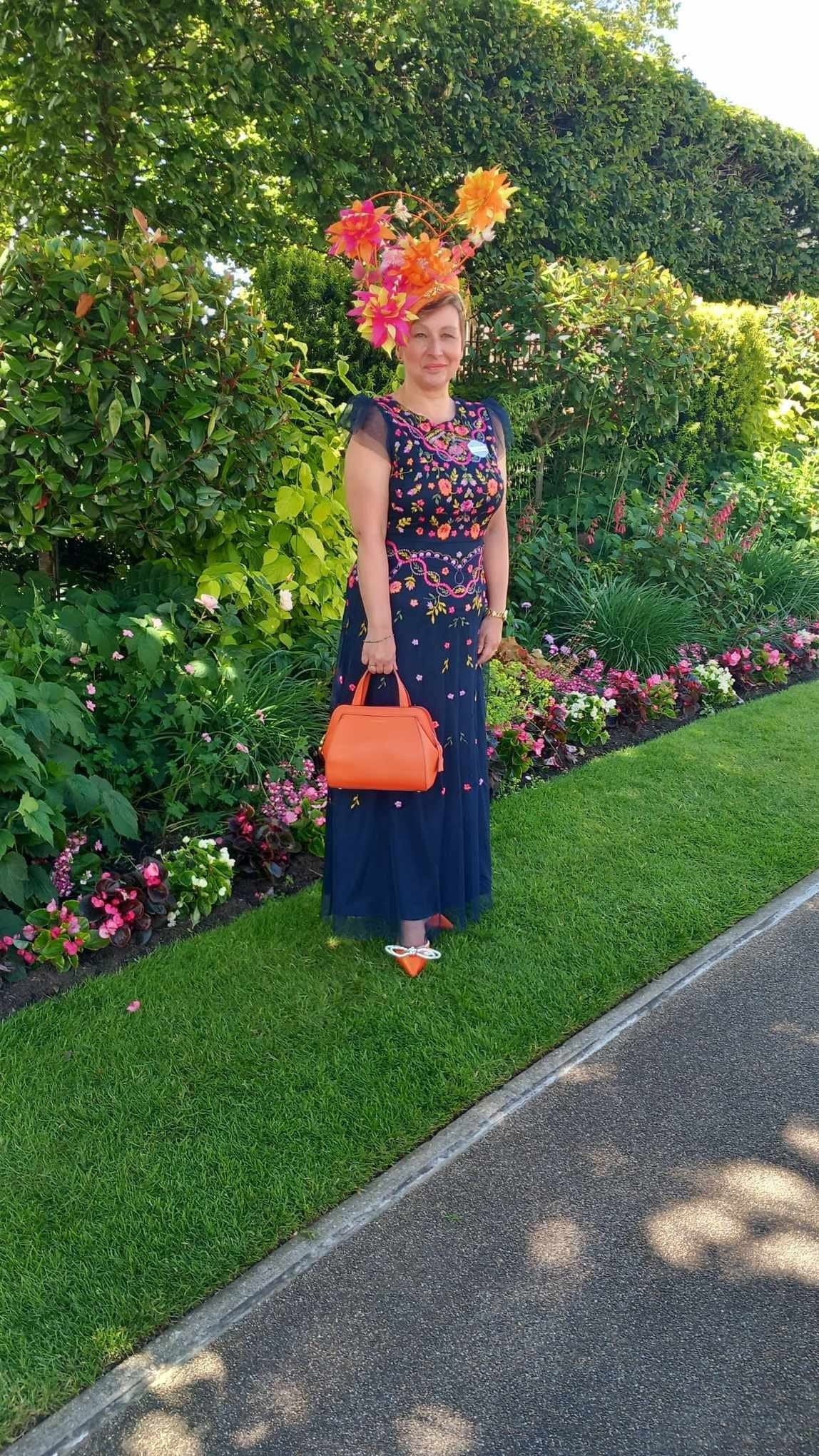 Beautiful handmade 2024 Royal Ascot showpiece a large heart frame trimmed with a large feather flowers front and back with floaty chevron feathers chiffon butterflies and bees attached to a teardrop orange sinamay base .Secured with hat elastic and a gold headband and comb this is a weighty piece but i wore it all day with no issue. This is designed to be worn to the side of the right eye one size fits all. This has been worn once by me and is sold as worn. As with all my Ascot Showpieces there a one off and will not be repeated.
