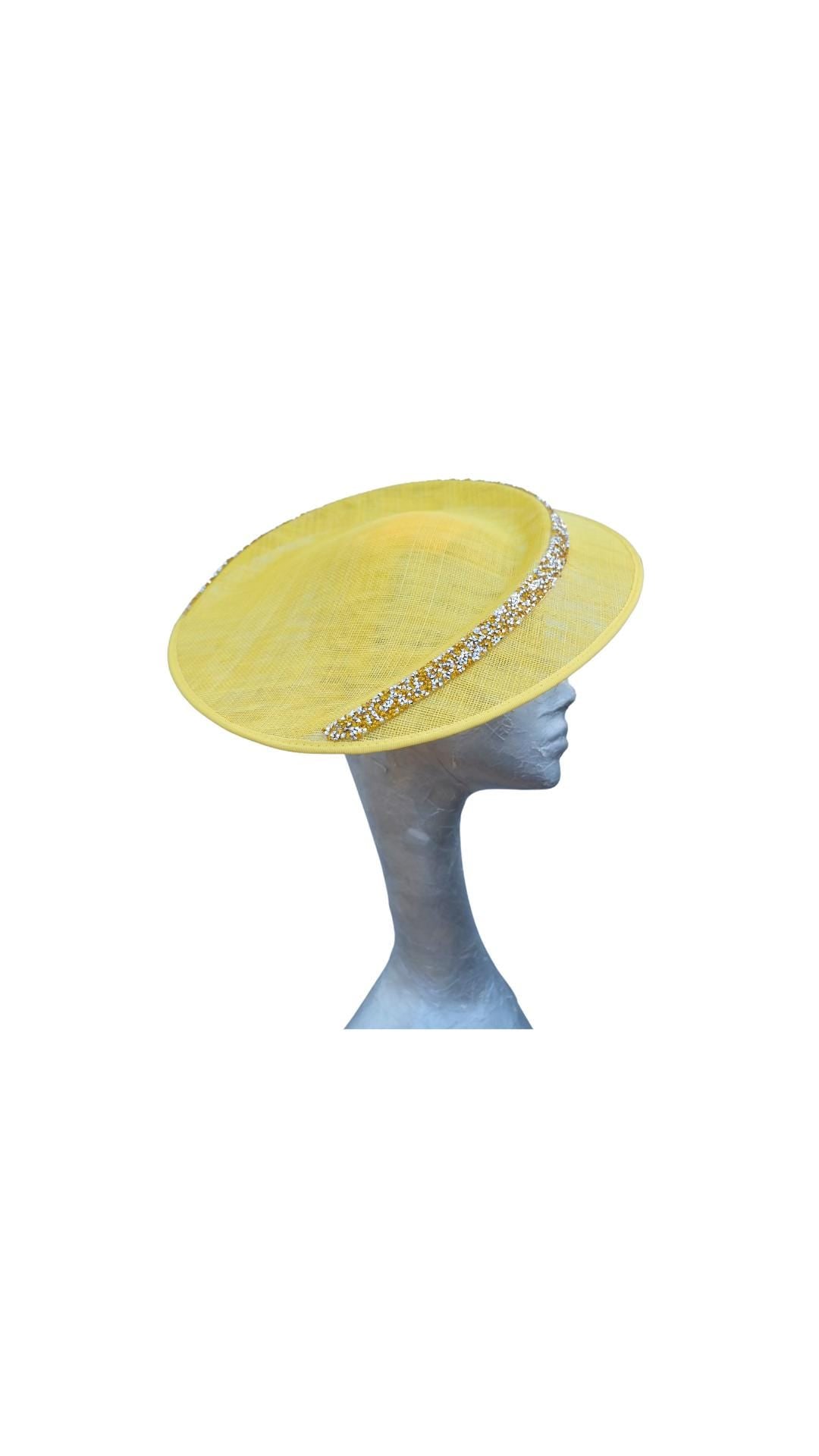 A yellow oval sinamay hatinator with yellow and clear crystal trim, the hatinator measures Top-Bottom 42cm, Side-Side 37cm. and fits securely with an Alice band
