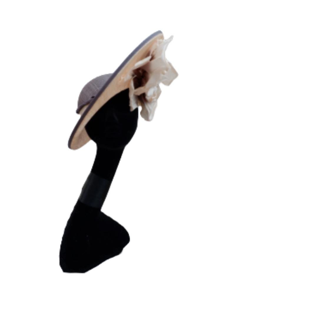 This is a stunning hat in Vanilla & Praline with silk two tone flower ruffled rose to the underside this will need a hat pin to secure as it sits with a hat elasticPlease note:- Handmade in the United Kingdom