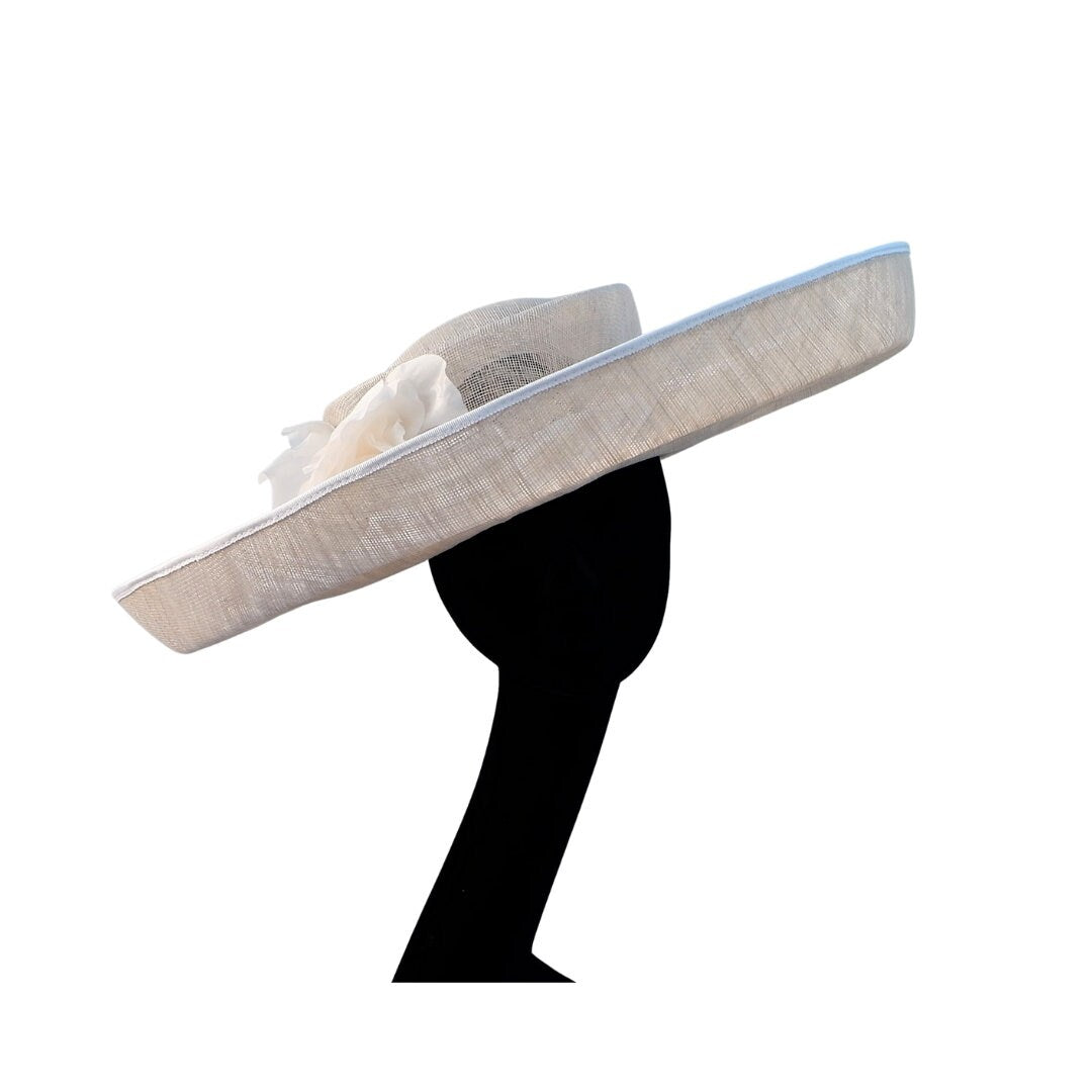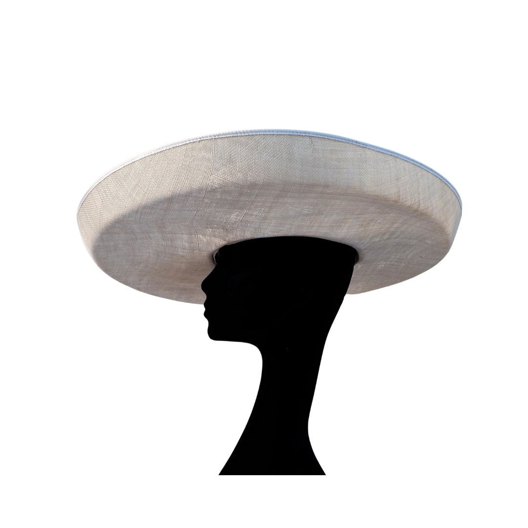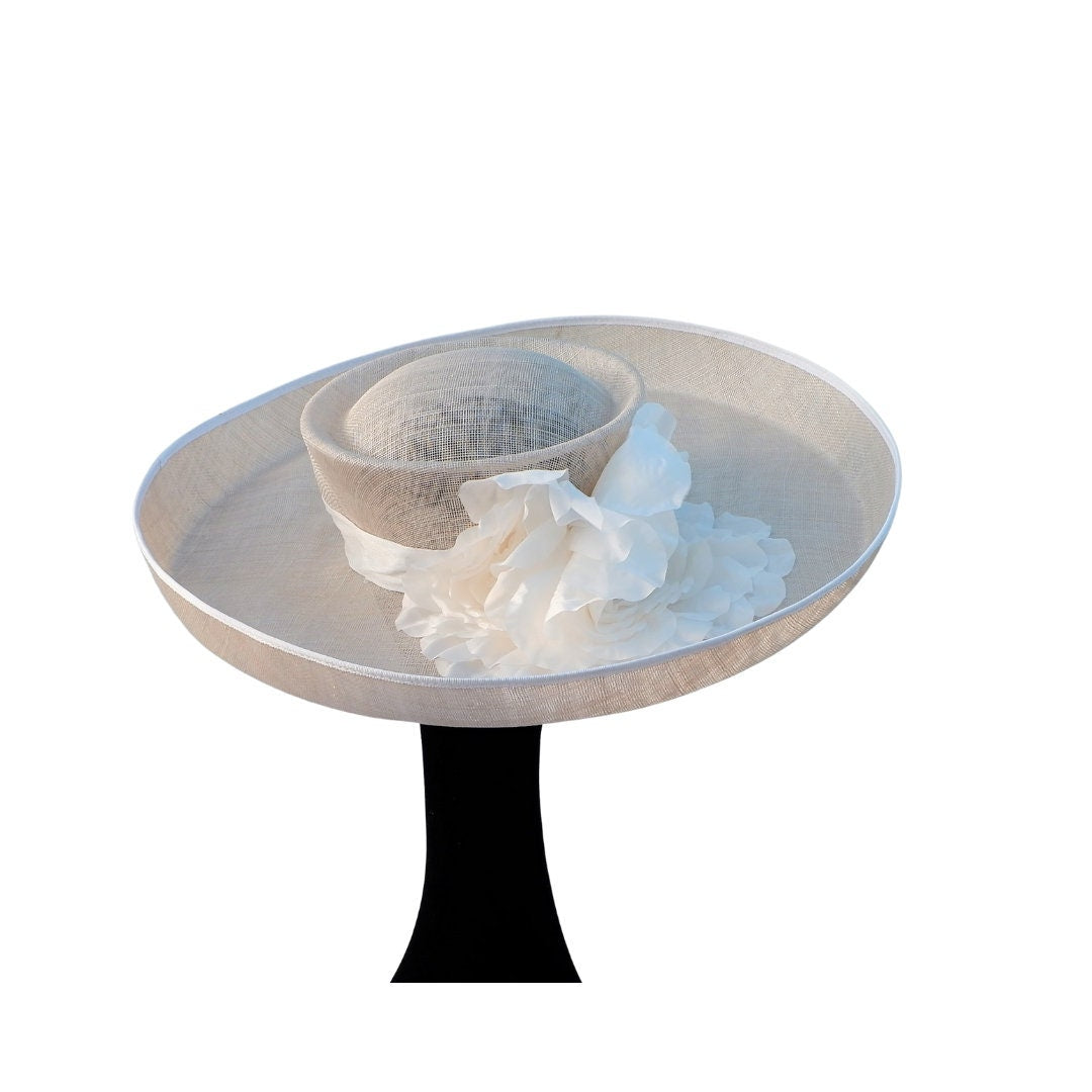 The most fabulous extra large feature hat in grey trimmed in white with large white silk roses by Marie-Anne of Hats2go a statment piece for an daring Mother of the bride or a stand out in the crowd piece at Ascot. This hat can be made in many more colours so please email me if you are interested in ordering another colour.Please note:- Handmade in the United Kingdom