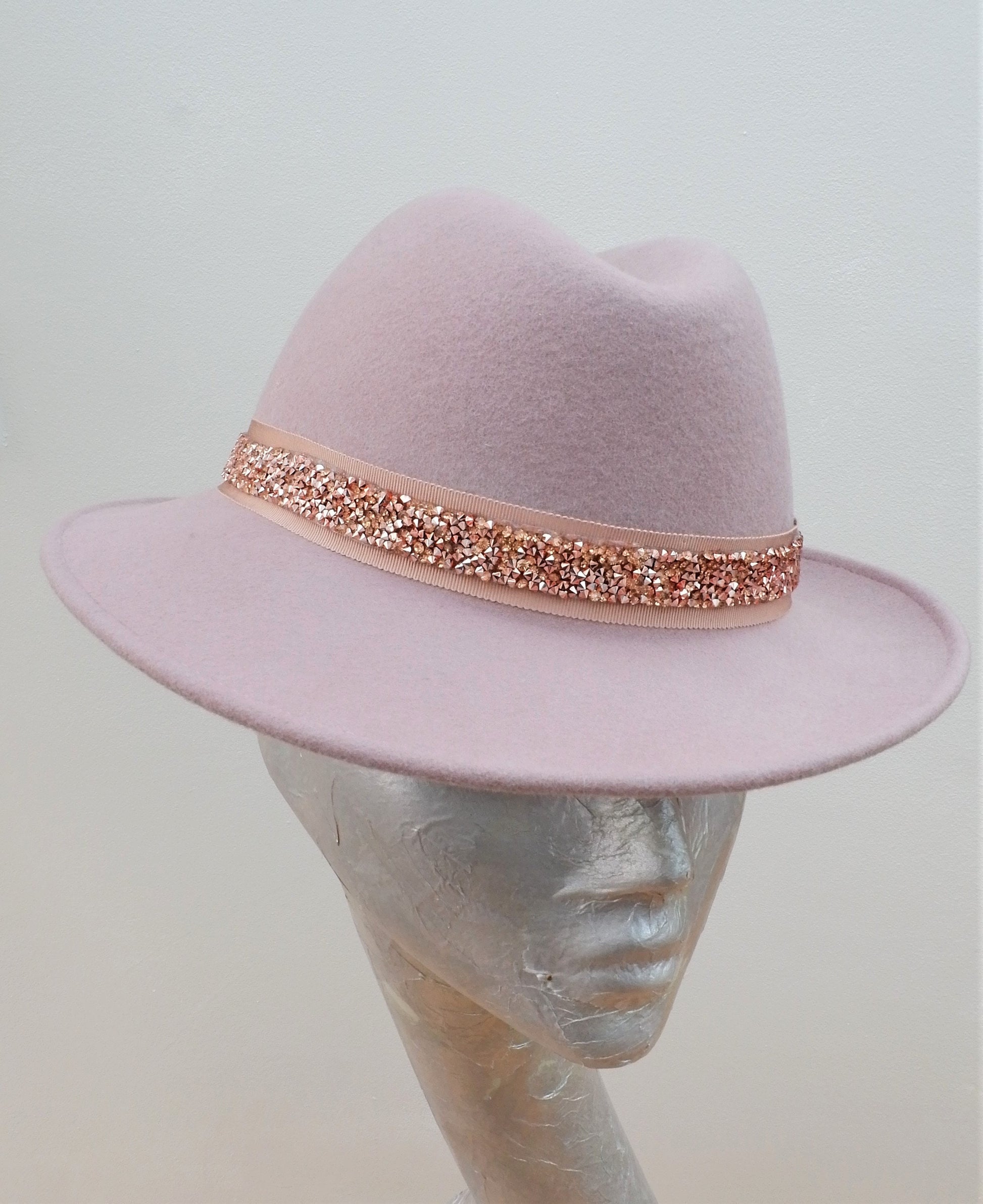 This is a beautiful rigid felt Trilby in a stunning shade of blush with a Rose gold Diamante trim