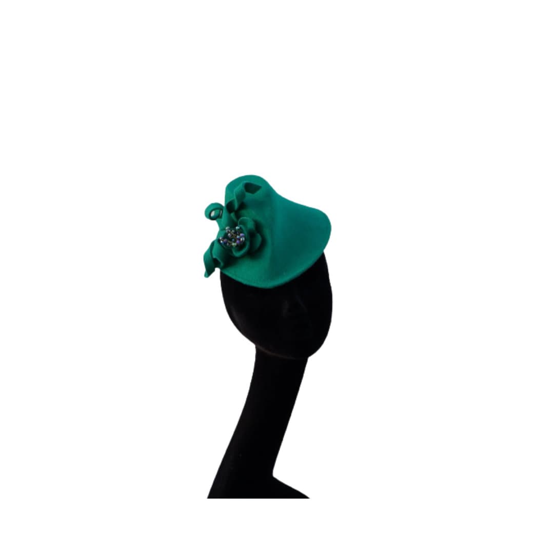 Due to the new EU GPSR regulations i will be no longer able to send any orders to EUROPE..... A beautiful True Emerald green colour felt 40's style percher hat the resolution of the monitors makes this look more like bottle green but is a vibrant emerald please request a sample if unsure. Secured to the head with concealed crocodile clips Many more colours available to order