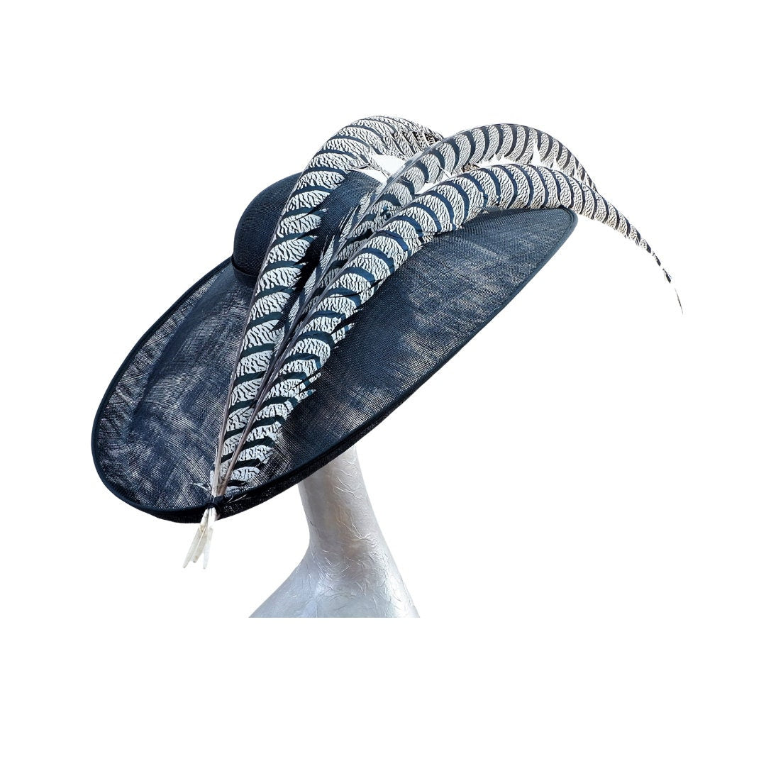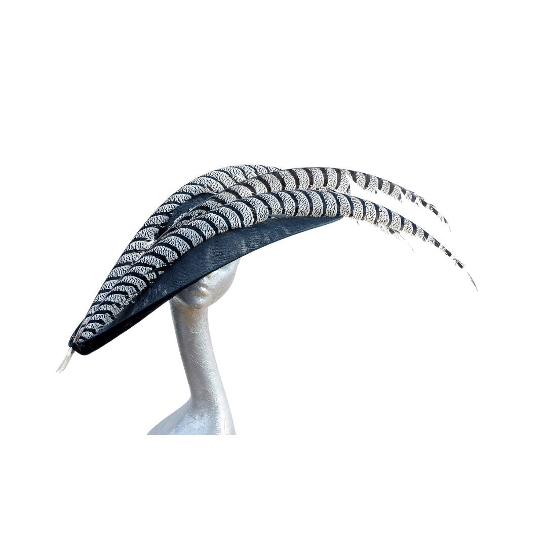 A stunning extra large oval shaped brimmed hat measuring :-Brim; Side-Side 57cm, Front-Back 41cm, Crown 6cm. in Black with 3 extra long 45" Lady Amhurst feathers in Off white & Black colour.