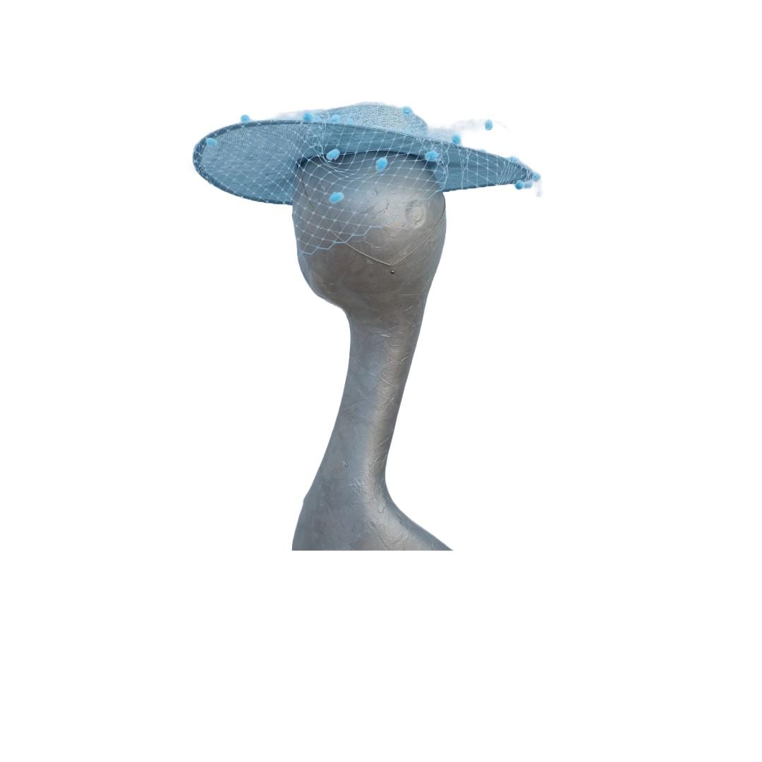 This is a stunning hat feature Spanish style boater in Pale blue with silver lurex thread running through with a full merry widow veil . This style has been and still will be trending for the forth coming race season. Due to the shallow crown this does not sit over the head but is a percher style and sits on top of the head and has a hat elastic to help secure