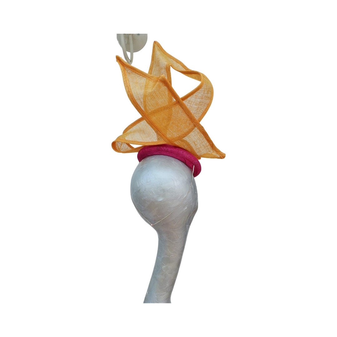 Beautiful free form Orange sinamay twist on a cerise cocktail hat base secured with a hat elastic so you can position anywhere on the head. This is a one off as you can never form the sinamay to match